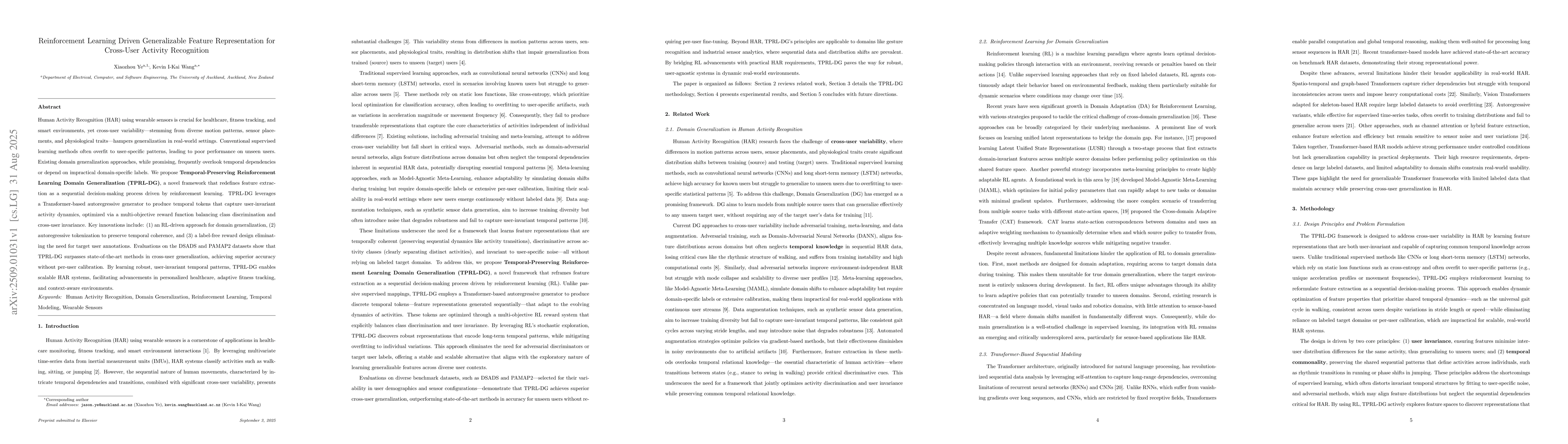 Human Activity Recognition (HAR) using wearable sensors is crucial for healthcare, fitness tracking, and smart environments, yet cross-user variability -- stemming from diverse motion patterns, sensor placements, and physiological traits -- hampers generalization in real-world settings. Conventional supervised learning methods often overfit to user-specific patterns, leading to poor performance on unseen users. Existing domain generalization approaches, while promising, frequently overlook temporal dependencies or depend on impractical domain-specific labels. We propose Temporal-Preserving Reinforcement Learning Domain Generalization (TPRL-DG), a novel framework that redefines feature extraction as a sequential decision-making process driven by reinforcement learning. TPRL-DG leverages a Transformer-based autoregressive generator to produce temporal tokens that capture user-invariant activity dynamics, optimized via a multi-objective reward function balancing class discrimination and cross-user invariance. Key innovations include: (1) an RL-driven approach for domain generalization, (2) autoregressive tokenization to preserve temporal coherence, and (3) a label-free reward design eliminating the need for target user annotations. Evaluations on the DSADS and PAMAP2 datasets show that TPRL-DG surpasses state-of-the-art methods in cross-user generalization, achieving superior accuracy without per-user calibration. By learning robust, user-invariant temporal patterns, TPRL-DG enables scalable HAR systems, facilitating advancements in personalized healthcare, adaptive fitness tracking, and context-aware environments.