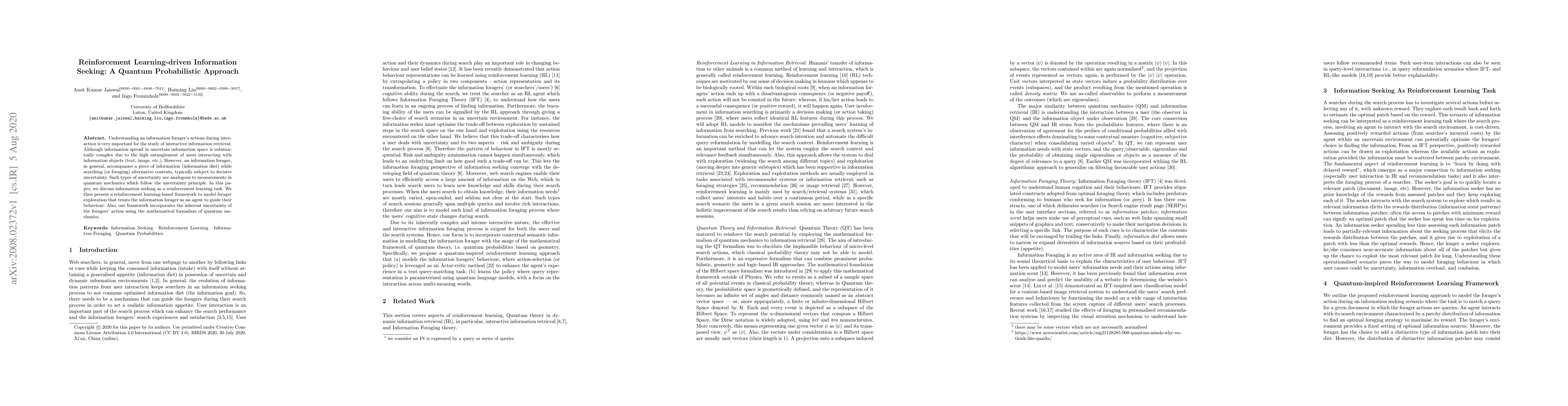 Understanding an information forager's actions during interaction is very important for the study of interactive information retrieval. Although information spread in uncertain information space is substantially complex due to the high entanglement of users interacting with information objects~(text, image, etc.). However, an information forager, in general, accompanies a piece of information (information diet) while searching (or foraging) alternative contents, typically subject to decisive uncertainty. Such types of uncertainty are analogous to measurements in quantum mechanics which follow the uncertainty principle. In this paper, we discuss information seeking as a reinforcement learning task. We then present a reinforcement learning-based framework to model forager exploration that treats the information forager as an agent to guide their behaviour. Also, our framework incorporates the inherent uncertainty of the foragers' action using the mathematical formalism of quantum mechanics.
