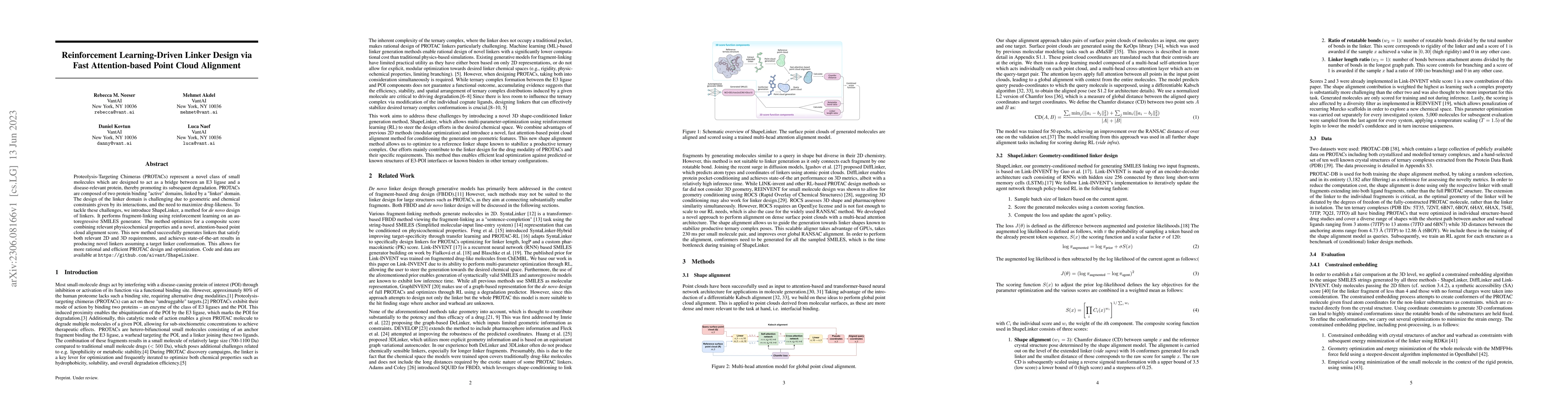 This paper introduces ShapeLinker, a reinforcement learning-driven method for designing linkers in Proteolysis-Targeting Chimeras (PROTACs) using an attention-based point cloud alignment. The method optimizes for physicochemical properties and 3D alignment, achieving state-of-the-art results in generating linkers that meet both 2D and 3D design criteria.