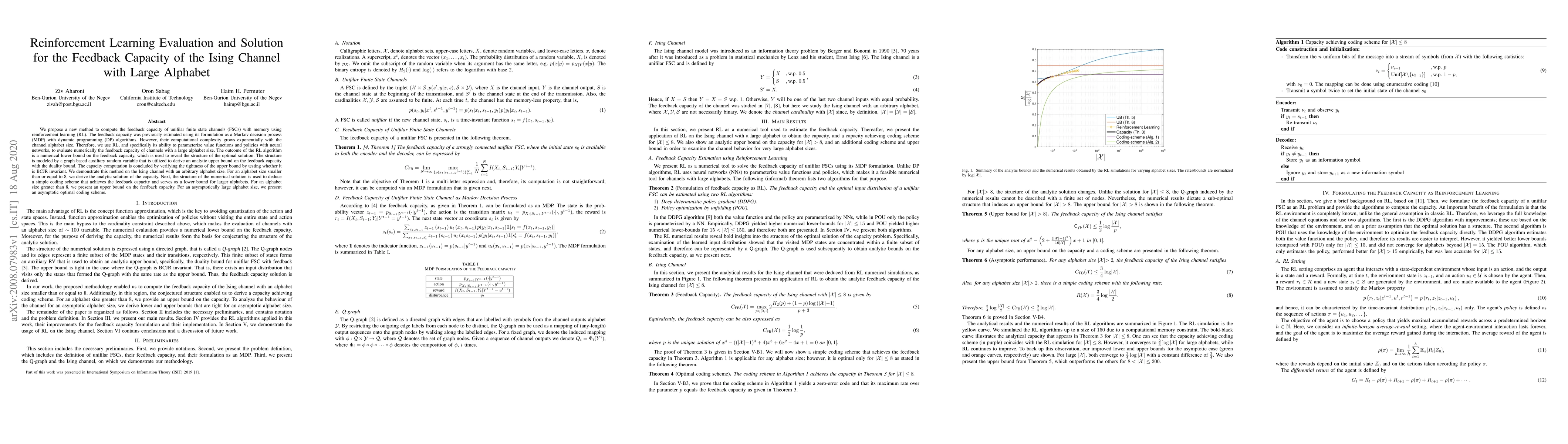 We propose a new method to compute the feedback capacity of unifilar finite state channels (FSCs) with memory using reinforcement learning (RL). The feedback capacity was previously estimated using its formulation as a Markov decision process (MDP) with dynamic programming (DP) algorithms. However, their computational complexity grows exponentially with the channel alphabet size. Therefore, we use RL, and specifically its ability to parameterize value functions and policies with neural networks, to evaluate numerically the feedback capacity of channels with a large alphabet size. The outcome of the RL algorithm is a numerical lower bound on the feedback capacity, which is used to reveal the structure of the optimal solution. The structure is modeled by a graph-based auxiliary random variable that is utilized to derive an analytic upper bound on the feedback capacity with the duality bound. The capacity computation is concluded by verifying the tightness of the upper bound by testing whether it is BCJR invariant. We demonstrate this method on the Ising channel with an arbitrary alphabet size. For an alphabet size smaller than or equal to 8, we derive the analytic solution of the capacity. Next, the structure of the numerical solution is used to deduce a simple coding scheme that achieves the feedback capacity and serves as a lower bound for larger alphabets. For an alphabet size greater than 8, we present an upper bound on the feedback capacity. For an asymptotically large alphabet size, we present an asymptotic optimal coding scheme.