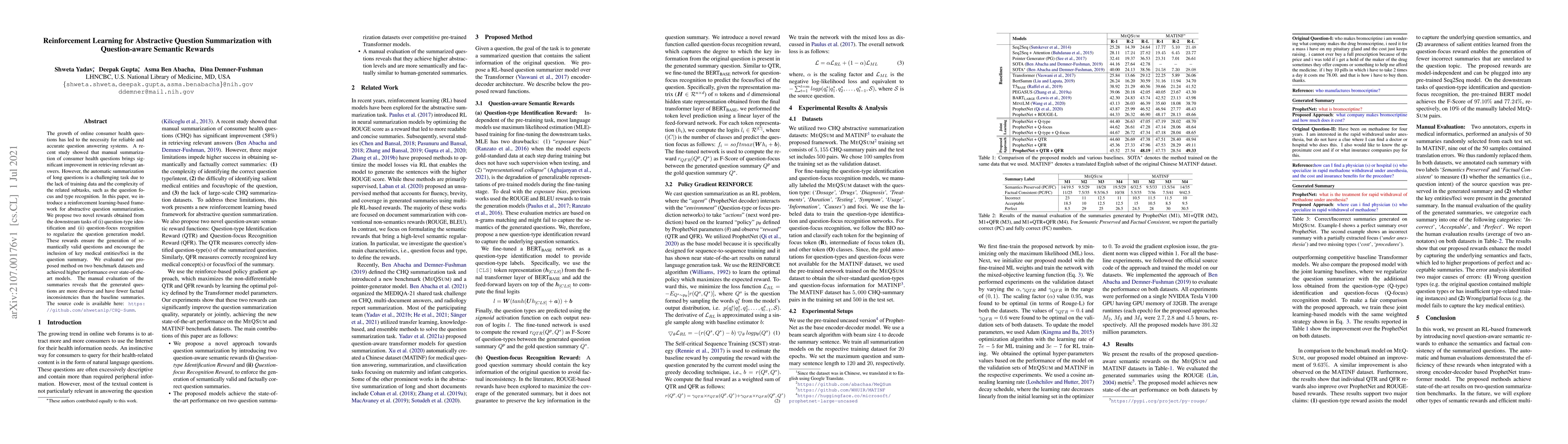 This paper presents a reinforcement learning framework for abstractive summarization of consumer health questions, utilizing semantic rewards from question-type and focus recognition to enhance the relevance and accuracy of generated summaries. The proposed method outperforms existing models on benchmark datasets and produces more diverse and factually consistent summaries.
