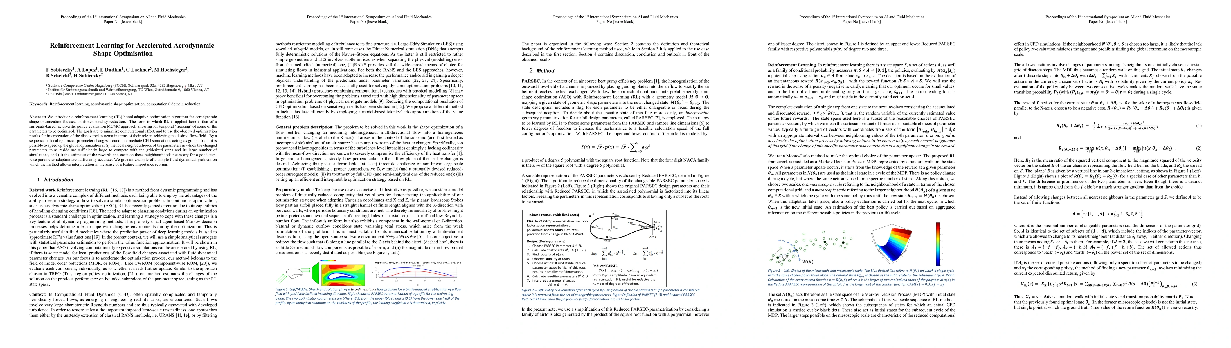 We introduce a reinforcement learning (RL) based adaptive optimization algorithm for aerodynamic shape optimization focused on dimensionality reduction. The form in which RL is applied here is that of a surrogate-based, actor-critic policy evaluation MCMC approach allowing for temporal 'freezing' of some of the parameters to be optimized. The goals are to minimize computational effort, and to use the observed optimization results for interpretation of the discovered extrema in terms of their role in achieving the desired flow-field. By a sequence of local optimized parameter changes around intermediate CFD simulations acting as ground truth, it is possible to speed up the global optimization if (a) the local neighbourhoods of the parameters in which the changed parameters must reside are sufficiently large to compete with the grid-sized steps and its large number of simulations, and (b) the estimates of the rewards and costs on these neighbourhoods necessary for a good step-wise parameter adaption are sufficiently accurate. We give an example of a simple fluid-dynamical problem on which the method allows interpretation in the sense of a feature importance scoring.