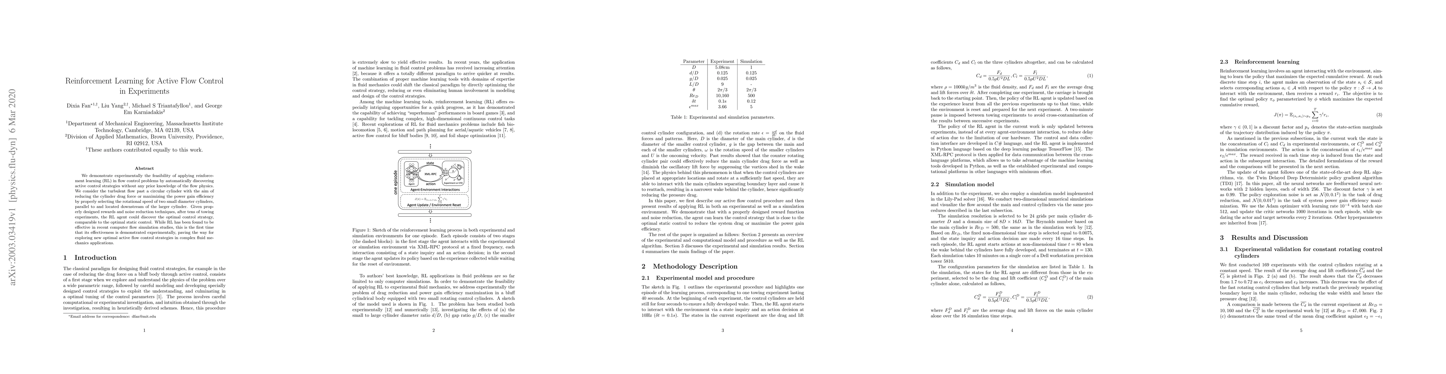 This paper experimentally validates the use of reinforcement learning for active flow control, demonstrating its ability to autonomously discover optimal strategies for reducing drag or maximizing power gain in turbulent flow past a cylinder, without prior knowledge of flow physics. The RL agent successfully identifies effective control strategies through iterative towing experiments, comparable to optimal static control methods.