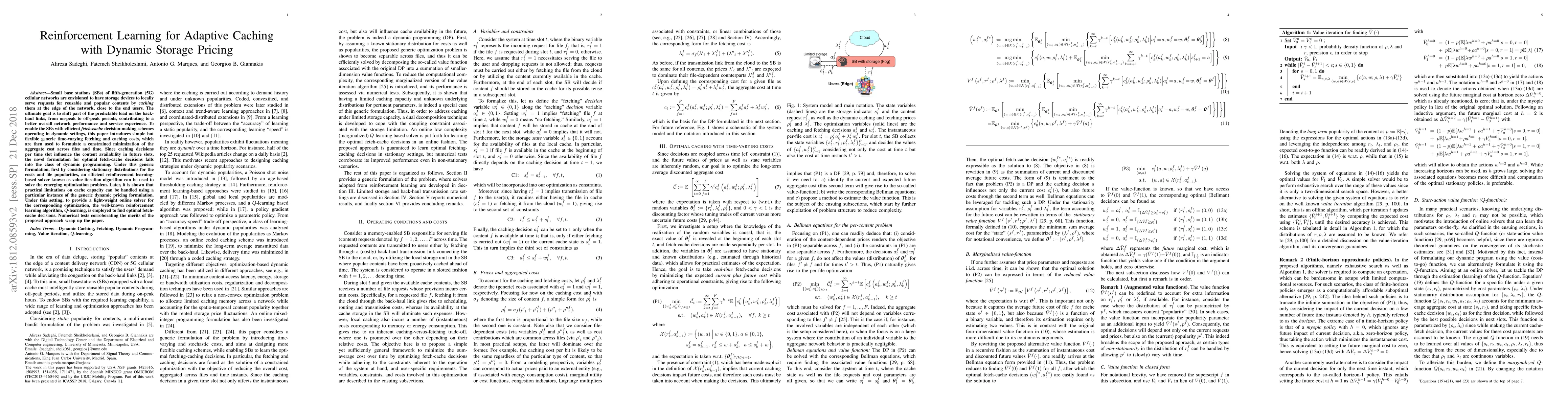 Small base stations (SBs) of fifth-generation (5G) cellular networks are envisioned to have storage devices to locally serve requests for reusable and popular contents by \emph{caching} them at the edge of the network, close to the end users. The ultimate goal is to shift part of the predictable load on the back-haul links, from on-peak to off-peak periods, contributing to a better overall network performance and service experience. To enable the SBs with efficient \textit{fetch-cache} decision-making schemes operating in dynamic settings, this paper introduces simple but flexible generic time-varying fetching and caching costs, which are then used to formulate a constrained minimization of the aggregate cost across files and time. Since caching decisions per time slot influence the content availability in future slots, the novel formulation for optimal fetch-cache decisions falls into the class of dynamic programming. Under this generic formulation, first by considering stationary distributions for the costs and file popularities, an efficient reinforcement learning-based solver known as value iteration algorithm can be used to solve the emerging optimization problem. Later, it is shown that practical limitations on cache capacity can be handled using a particular instance of the generic dynamic pricing formulation. Under this setting, to provide a light-weight online solver for the corresponding optimization, the well-known reinforcement learning algorithm, $Q$-learning, is employed to find optimal fetch-cache decisions. Numerical tests corroborating the merits of the proposed approach wrap up the paper.