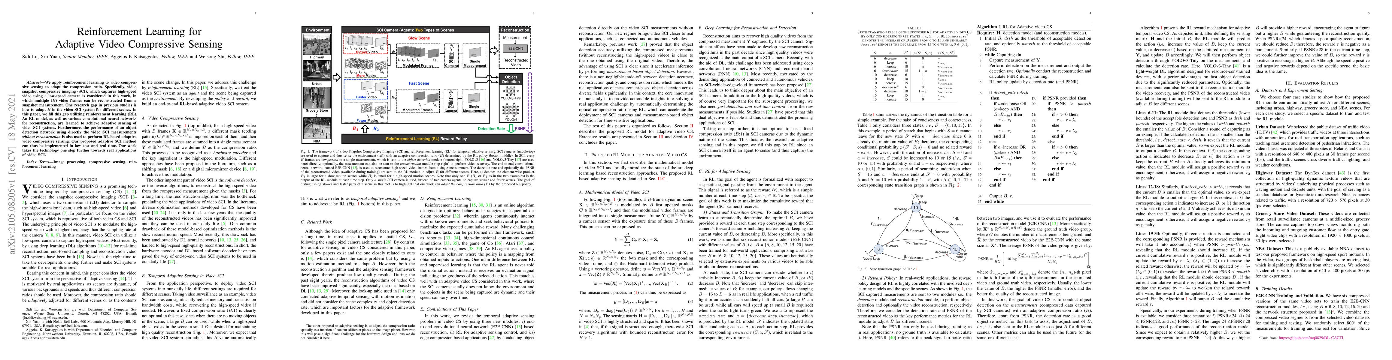 This paper applies reinforcement learning to adaptively adjust the compression ratio in video snapshot compressive imaging (SCI), enabling the reconstruction of multiple video frames from a single snapshot. The study addresses the challenge of dynamically adapting the number of frames reconstructed for different scenes, proposing an RL model and convolutional neural networks for real-time, low-cost adaptive video SCI.