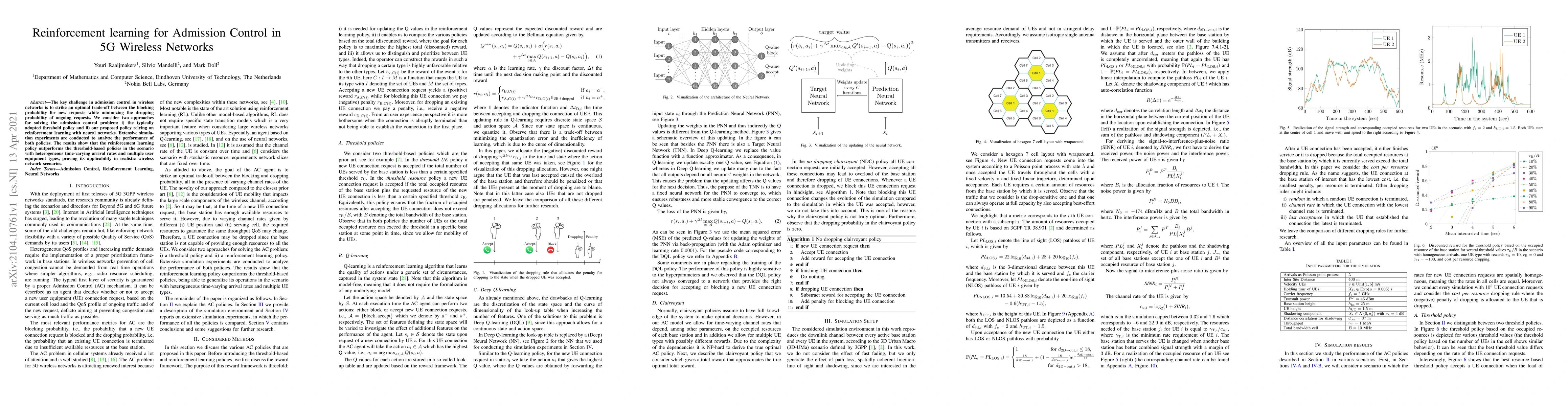 This paper proposes a reinforcement learning approach with neural networks for admission control in 5G wireless networks, outperforming traditional threshold-based policies in simulations with heterogeneous traffic and multiple user types. The results demonstrate the method's effectiveness in dynamic network conditions.