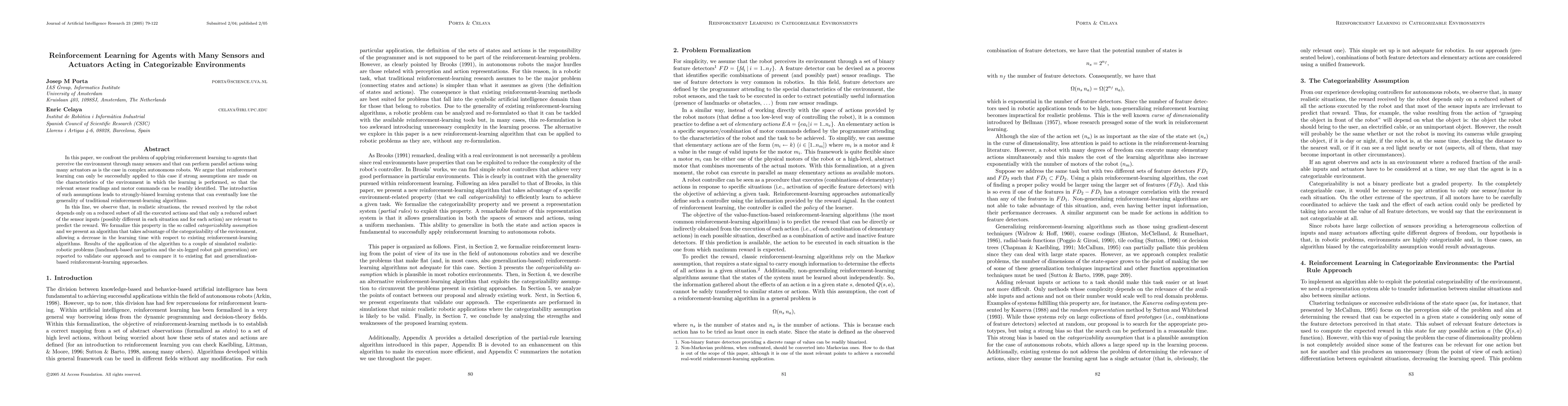 In this paper, we confront the problem of applying reinforcement learning to agents that perceive the environment through many sensors and that can perform parallel actions using many actuators as is the case in complex autonomous robots. We argue that reinforcement learning can only be successfully applied to this case if strong assumptions are made on the characteristics of the environment in which the learning is performed, so that the relevant sensor readings and motor commands can be readily identified. The introduction of such assumptions leads to strongly-biased learning systems that can eventually lose the generality of traditional reinforcement-learning algorithms. In this line, we observe that, in realistic situations, the reward received by the robot depends only on a reduced subset of all the executed actions and that only a reduced subset of the sensor inputs (possibly different in each situation and for each action) are relevant to predict the reward. We formalize this property in the so called 'categorizability assumption' and we present an algorithm that takes advantage of the categorizability of the environment, allowing a decrease in the learning time with respect to existing reinforcement-learning algorithms. Results of the application of the algorithm to a couple of simulated realistic-robotic problems (landmark-based navigation and the six-legged robot gait generation) are reported to validate our approach and to compare it to existing flat and generalization-based reinforcement-learning approaches.