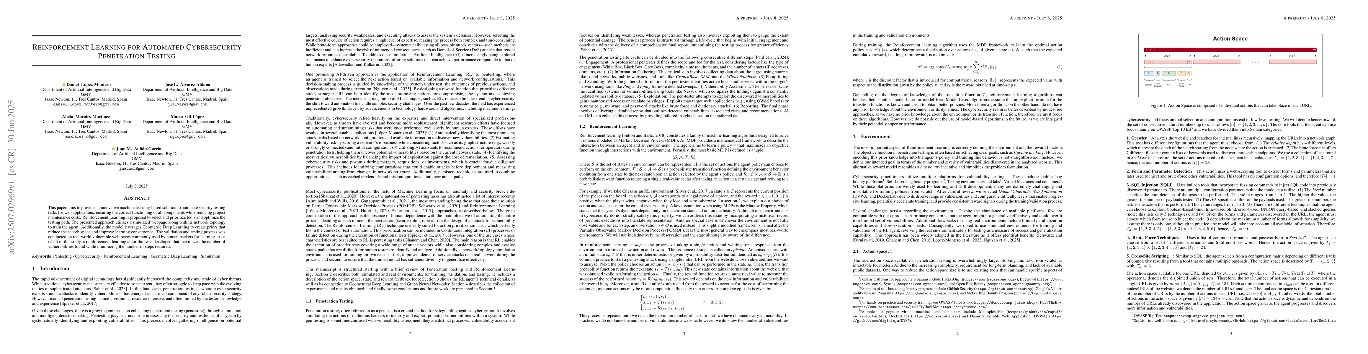 This paper aims to provide an innovative machine learning-based solution to automate security testing tasks for web applications, ensuring the correct functioning of all components while reducing project maintenance costs. Reinforcement Learning is proposed to select and prioritize tools and optimize the testing path. The presented approach utilizes a simulated webpage along with its network topology to train the agent. Additionally, the model leverages Geometric Deep Learning to create priors that reduce the search space and improve learning convergence. The validation and testing process was conducted on real-world vulnerable web pages commonly used by human hackers for learning. As a result of this study, a reinforcement learning algorithm was developed that maximizes the number of vulnerabilities found while minimizing the number of steps required