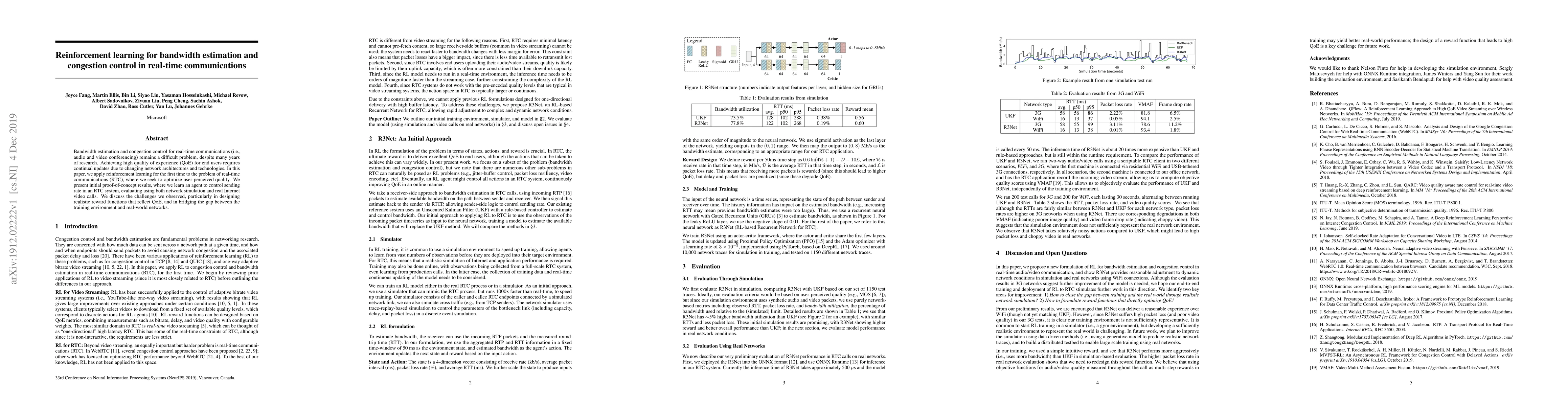 This paper explores the application of reinforcement learning for bandwidth estimation and congestion control in real-time communications, aiming to optimize user-perceived quality. Initial proof-of-concept results demonstrate an agent learning to control sending rates, evaluated through both simulations and real Internet video calls, highlighting challenges in reward function design and environment realism.