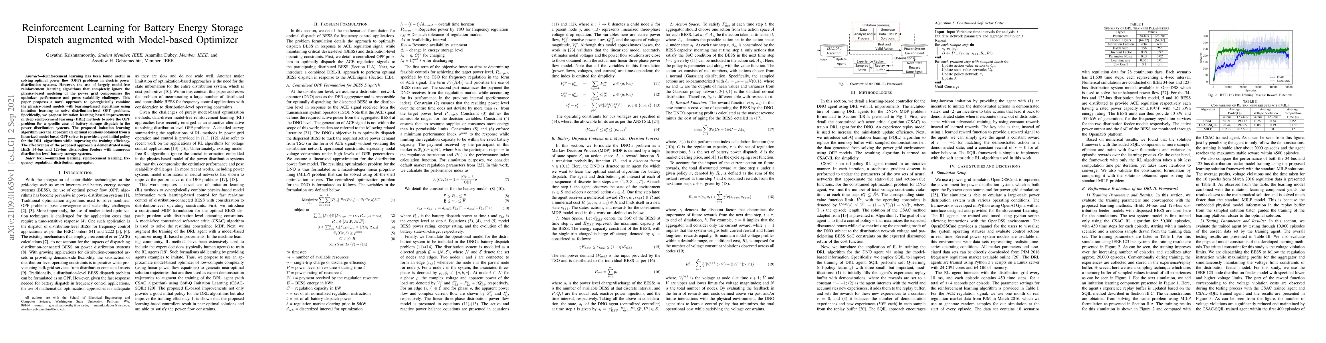 This paper proposes a reinforcement learning approach that combines physics-based models with deep learning to optimize battery energy storage dispatch in power distribution systems. The method uses imitation learning to leverage optimal solutions from a model-based optimizer, enhancing the efficiency and performance of deep reinforcement learning algorithms.