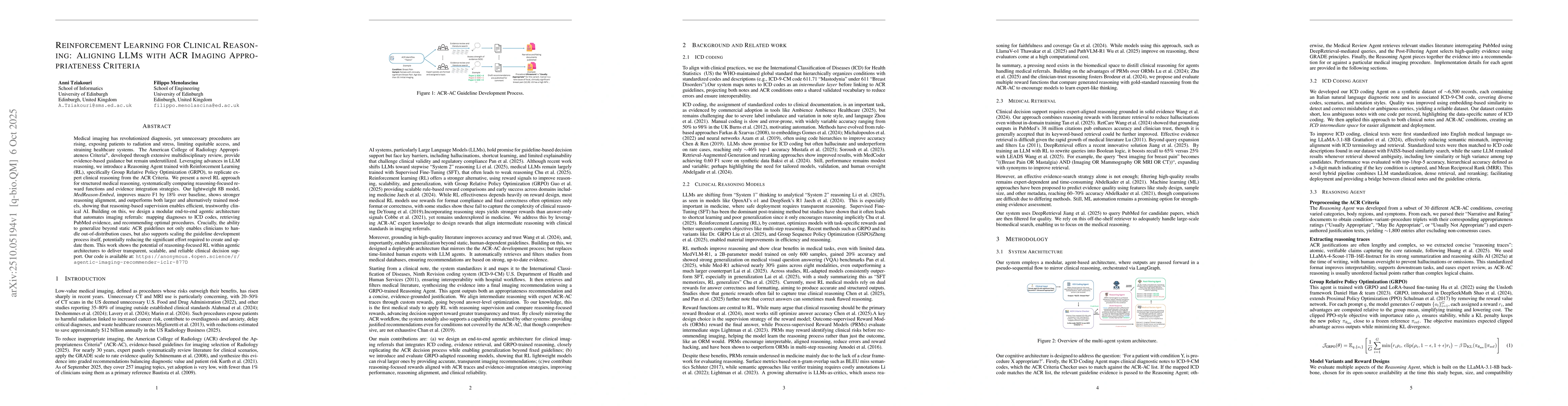 This research combines reinforcement learning with clinical knowledge retrieval and structured reasoning, creating a unique framework for AI-assisted diagnostic appropriateness evaluation that goes beyond traditional pattern recognition approaches.
