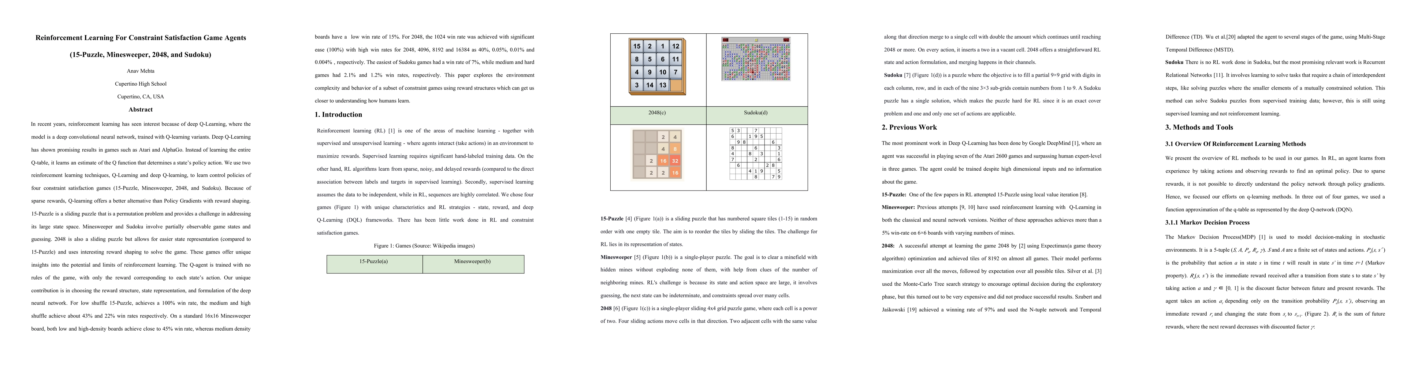This paper investigates reinforcement learning techniques, specifically Q-Learning and Deep Q-Learning, to train agents for four constraint satisfaction games: 15-Puzzle, Minesweeper, 2048, and Sudoku. The study highlights the unique challenges each game presents, achieving notable win rates across different game complexities.
