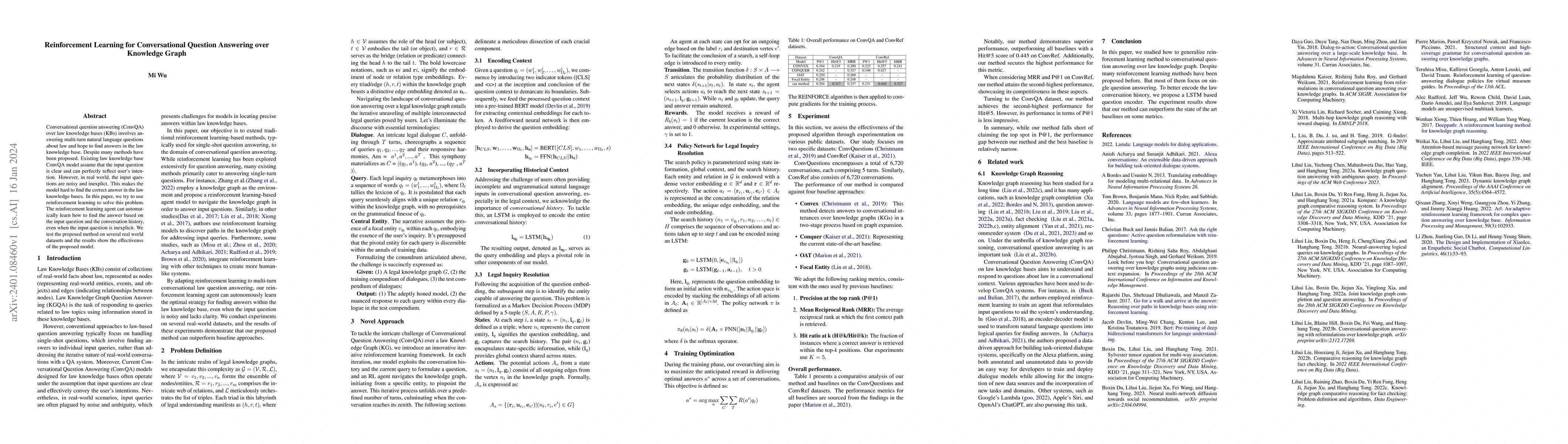 This research proposes a reinforcement learning approach for enhancing conversational question answering (ConvQA) over law knowledge bases by addressing the challenge of noisy and inexplicit input questions. The reinforcement learning agent learns to navigate conversation histories and input questions to find accurate answers, demonstrating effectiveness on real-world datasets.