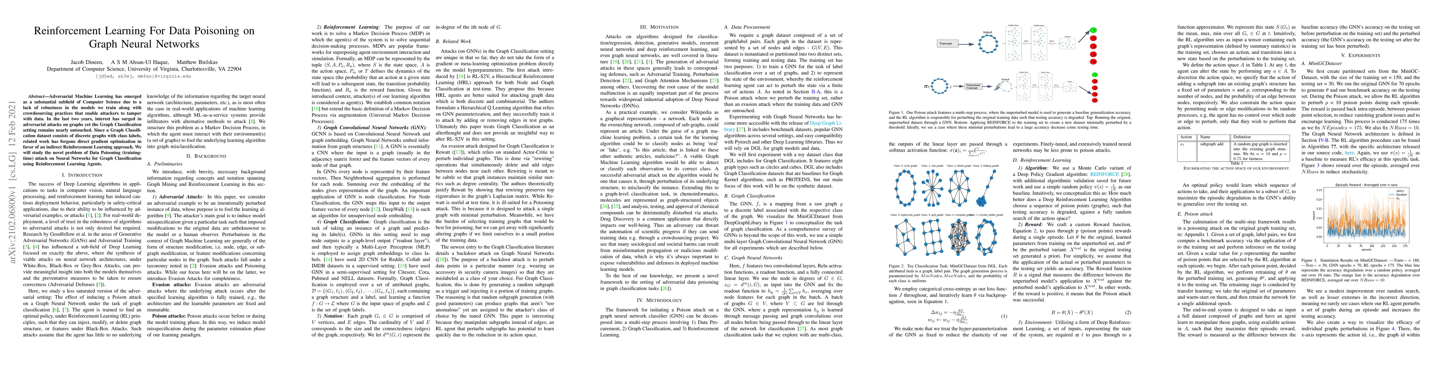Adversarial Machine Learning has emerged as a substantial subfield of Computer Science due to a lack of robustness in the models we train along with crowdsourcing practices that enable attackers to tamper with data. In the last two years, interest has surged in adversarial attacks on graphs yet the Graph Classification setting remains nearly untouched. Since a Graph Classification dataset consists of discrete graphs with class labels, related work has forgone direct gradient optimization in favor of an indirect Reinforcement Learning approach. We will study the novel problem of Data Poisoning (training time) attack on Neural Networks for Graph Classification using Reinforcement Learning Agents.