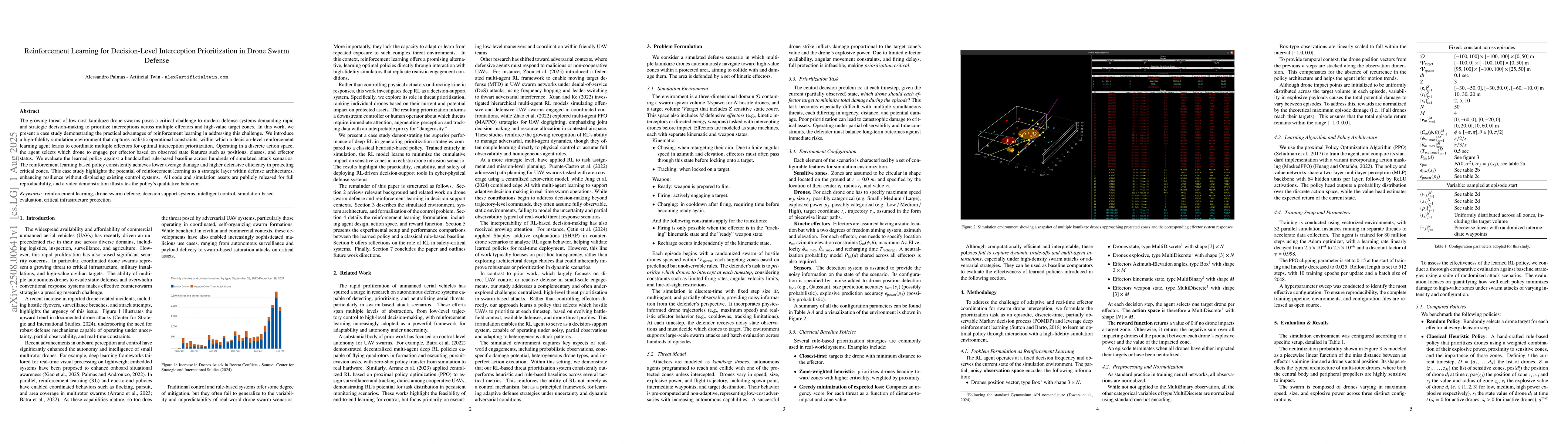 The growing threat of low-cost kamikaze drone swarms poses a critical challenge to modern defense systems demanding rapid and strategic decision-making to prioritize interceptions across multiple effectors and high-value target zones. In this work, we present a case study demonstrating the practical advantages of reinforcement learning in addressing this challenge. We introduce a high-fidelity simulation environment that captures realistic operational constraints, within which a decision-level reinforcement learning agent learns to coordinate multiple effectors for optimal interception prioritization. Operating in a discrete action space, the agent selects which drone to engage per effector based on observed state features such as positions, classes, and effector status. We evaluate the learned policy against a handcrafted rule-based baseline across hundreds of simulated attack scenarios. The reinforcement learning based policy consistently achieves lower average damage and higher defensive efficiency in protecting critical zones. This case study highlights the potential of reinforcement learning as a strategic layer within defense architectures, enhancing resilience without displacing existing control systems. All code and simulation assets are publicly released for full reproducibility, and a video demonstration illustrates the policy's qualitative behavior.