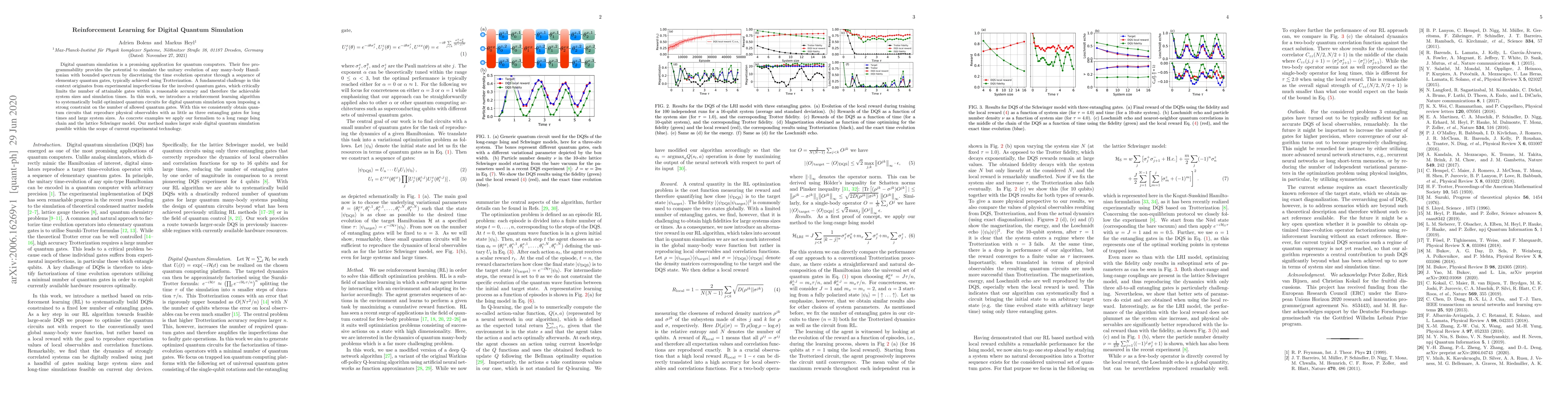 This paper proposes a reinforcement learning algorithm to optimize quantum circuits for digital quantum simulation, enabling accurate simulations with limited quantum gates due to experimental imperfections. The method successfully applies to long-range Ising chains and the lattice Schwinger model, making large-scale simulations feasible.