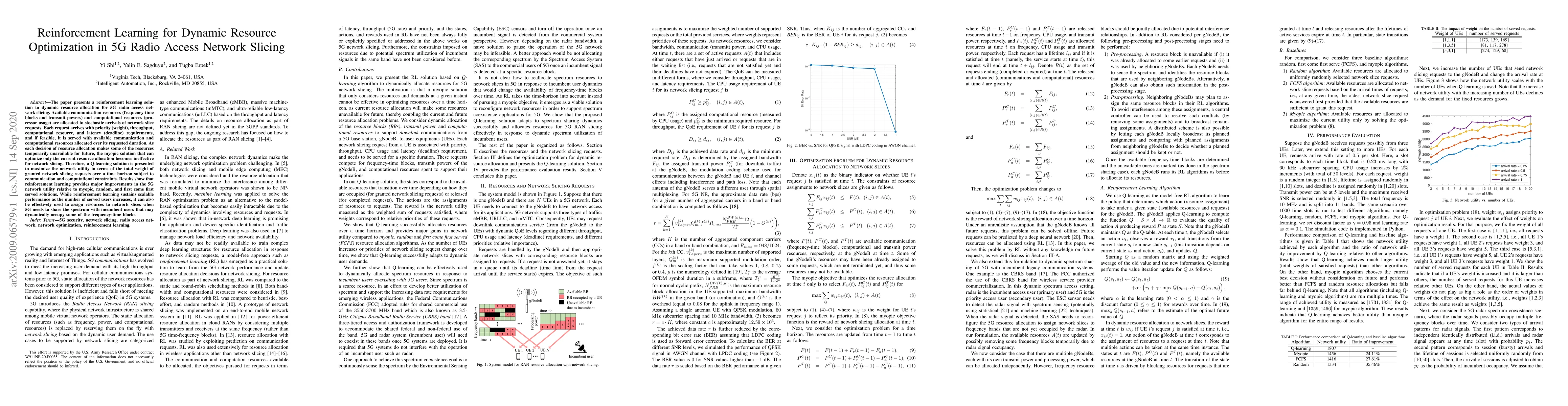 The paper proposes a reinforcement learning approach for optimizing dynamic resource allocation in 5G radio access network slicing, achieving significant improvements in network utility compared to myopic and random allocation methods. The Q-learning solution effectively manages communication and computational resources while accommodating stochastic slice requests and spectrum sharing with incumbent users.