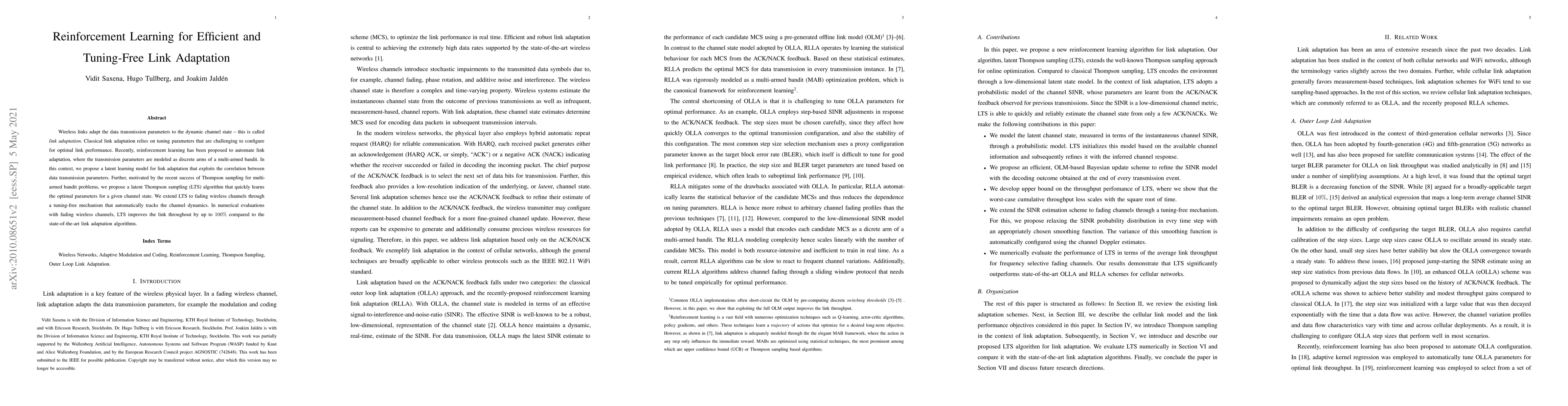 Wireless links adapt the data transmission parameters to the dynamic channel state -- this is called link adaptation. Classical link adaptation relies on tuning parameters that are challenging to configure for optimal link performance. Recently, reinforcement learning has been proposed to automate link adaptation, where the transmission parameters are modeled as discrete arms of a multi-armed bandit. In this context, we propose a latent learning model for link adaptation that exploits the correlation between data transmission parameters. Further, motivated by the recent success of Thompson sampling for multi-armed bandit problems, we propose a latent Thompson sampling (LTS) algorithm that quickly learns the optimal parameters for a given channel state. We extend LTS to fading wireless channels through a tuning-free mechanism that automatically tracks the channel dynamics. In numerical evaluations with fading wireless channels, LTS improves the link throughout by up to 100% compared to the state-of-the-art link adaptation algorithms.