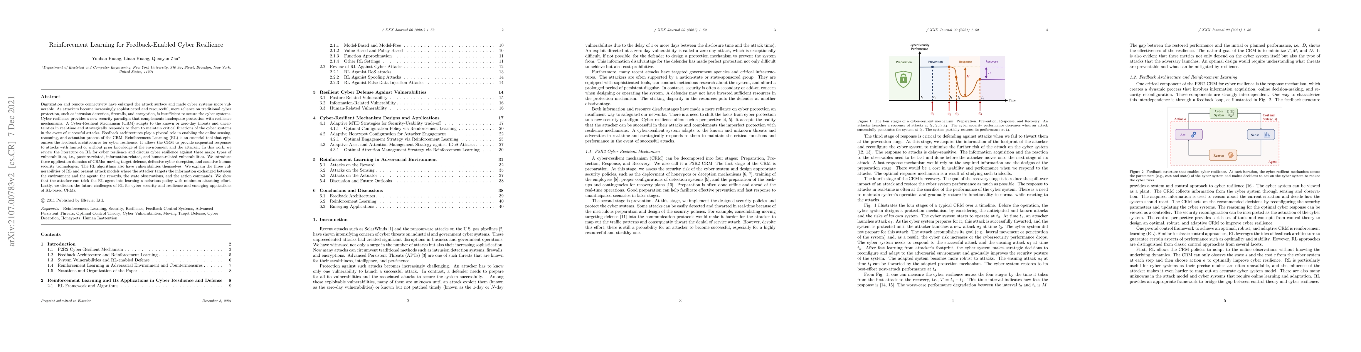 Digitization and remote connectivity have enlarged the attack surface and made cyber systems more vulnerable. As attackers become increasingly sophisticated and resourceful, mere reliance on traditional cyber protection, such as intrusion detection, firewalls, and encryption, is insufficient to secure the cyber systems. Cyber resilience provides a new security paradigm that complements inadequate protection with resilience mechanisms. A Cyber-Resilient Mechanism (CRM) adapts to the known or zero-day threats and uncertainties in real-time and strategically responds to them to maintain critical functions of the cyber systems in the event of successful attacks. Feedback architectures play a pivotal role in enabling the online sensing, reasoning, and actuation process of the CRM. Reinforcement Learning (RL) is an essential tool that epitomizes the feedback architectures for cyber resilience. It allows the CRM to provide sequential responses to attacks with limited or without prior knowledge of the environment and the attacker. In this work, we review the literature on RL for cyber resilience and discuss cyber resilience against three major types of vulnerabilities, i.e., posture-related, information-related, and human-related vulnerabilities. We introduce three application domains of CRMs: moving target defense, defensive cyber deception, and assistive human security technologies. The RL algorithms also have vulnerabilities themselves. We explain the three vulnerabilities of RL and present attack models where the attacker targets the information exchanged between the environment and the agent: the rewards, the state observations, and the action commands. We show that the attacker can trick the RL agent into learning a nefarious policy with minimum attacking effort. Lastly, we discuss the future challenges of RL for cyber security and resilience and emerging applications of RL-based CRMs.