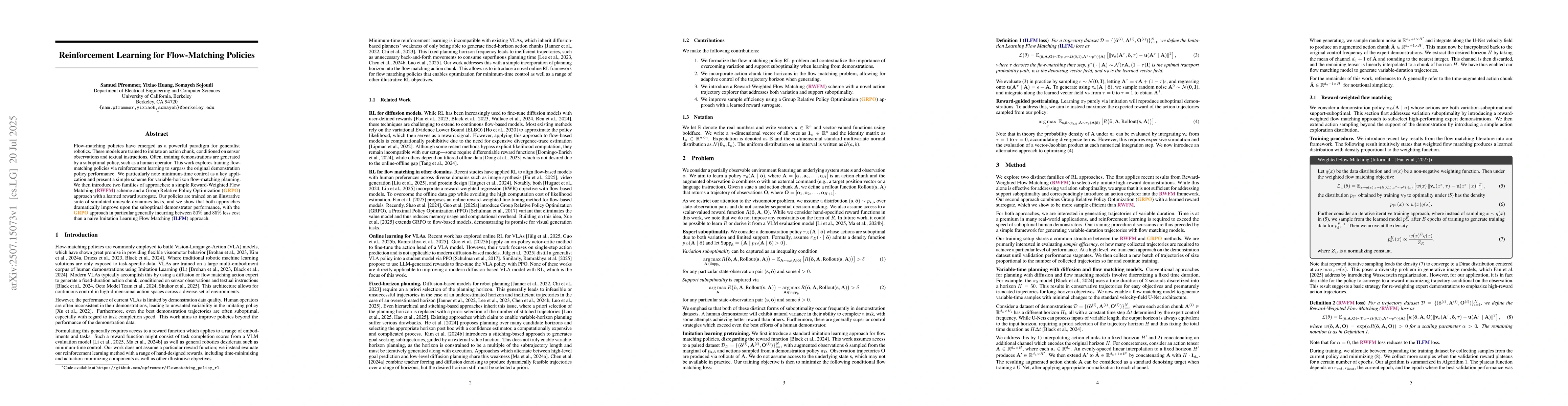 Flow-matching policies have emerged as a powerful paradigm for generalist robotics. These models are trained to imitate an action chunk, conditioned on sensor observations and textual instructions. Often, training demonstrations are generated by a suboptimal policy, such as a human operator. This work explores training flow-matching policies via reinforcement learning to surpass the original demonstration policy performance. We particularly note minimum-time control as a key application and present a simple scheme for variable-horizon flow-matching planning. We then introduce two families of approaches: a simple Reward-Weighted Flow Matching (RWFM) scheme and a Group Relative Policy Optimization (GRPO) approach with a learned reward surrogate. Our policies are trained on an illustrative suite of simulated unicycle dynamics tasks, and we show that both approaches dramatically improve upon the suboptimal demonstrator performance, with the GRPO approach in particular generally incurring between $50\%$ and $85\%$ less cost than a naive Imitation Learning Flow Matching (ILFM) approach.
