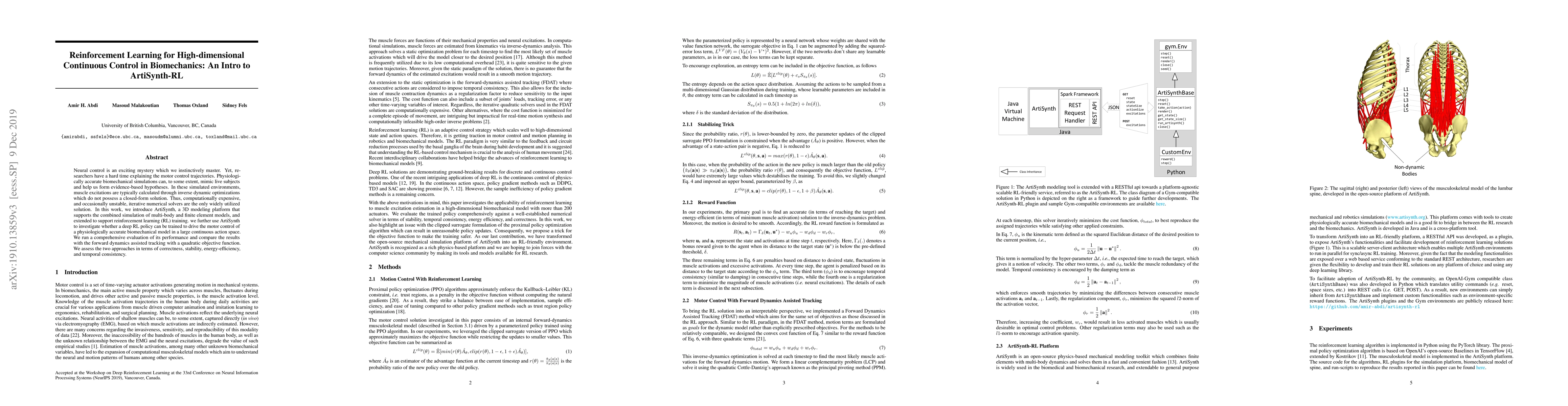 Neural control is an exciting mystery which we instinctively master. Yet, researchers have a hard time explaining the motor control trajectories. Physiologically accurate biomechanical simulations can, to some extent, mimic live subjects and help us form evidence-based hypotheses. In these simulated environments, muscle excitations are typically calculated through inverse dynamic optimizations which do not possess a closed-form solution. Thus, computationally expensive, and occasionally unstable, iterative numerical solvers are the only widely utilized solution. In this work, we introduce ArtiSynth, a 3D modeling platform that supports the combined simulation of multi-body and finite element models, and extended to support reinforcement learning (RL) training. we further use ArtiSynth to investigate whether a deep RL policy can be trained to drive the motor control of a physiologically accurate biomechanical model in a large continuous action space. We run a comprehensive evaluation of its performance and compare the results with the forward dynamics assisted tracking with a quadratic objective function. We assess the two approaches in terms of correctness, stability, energy-efficiency, and temporal consistency.