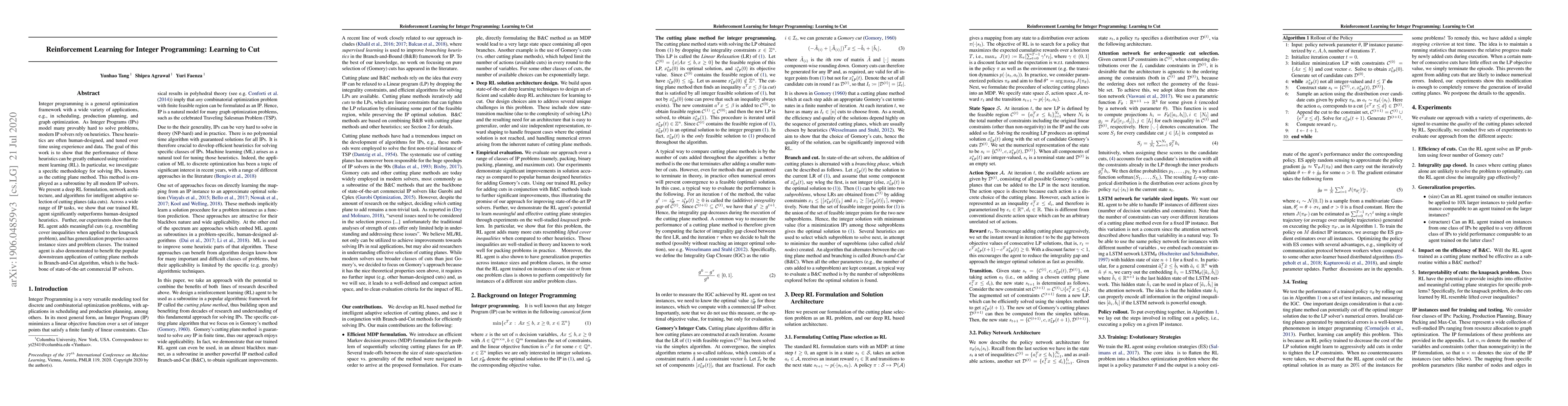 This paper explores using reinforcement learning to enhance integer programming solvers by intelligently selecting cutting planes, outperforming traditional heuristics and generalizing well to larger problem instances and different problem classes. The RL-based approach also improves the Branch-and-Cut algorithm, a key component of commercial IP solvers.