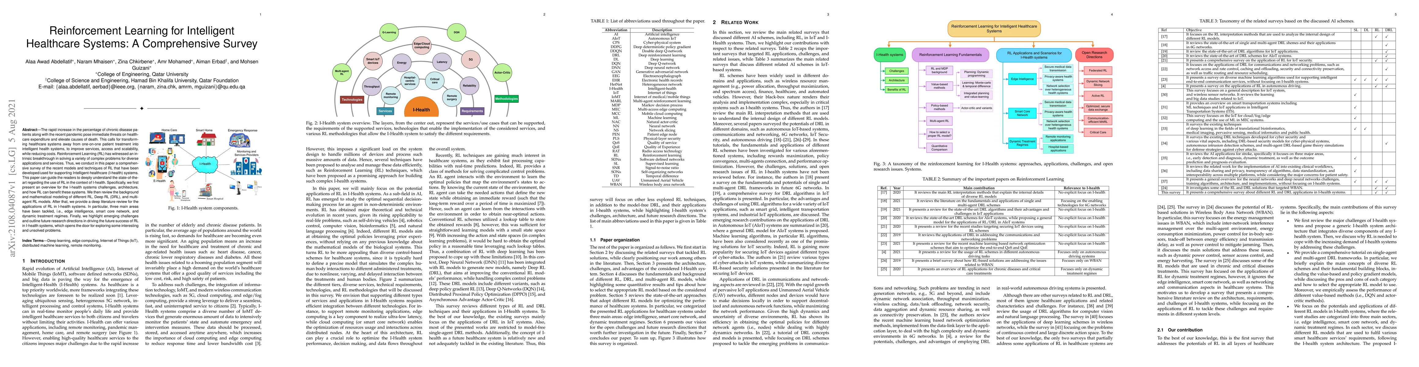 This paper provides a comprehensive survey of reinforcement learning (RL) techniques applied to intelligent healthcare systems, reviewing challenges, architectures, and the benefits of RL. It covers recent models, including Deep RL and multi-agent RL, and explores applications in edge intelligence, smart core networks, and dynamic treatment regimes, while also discussing future research directions.