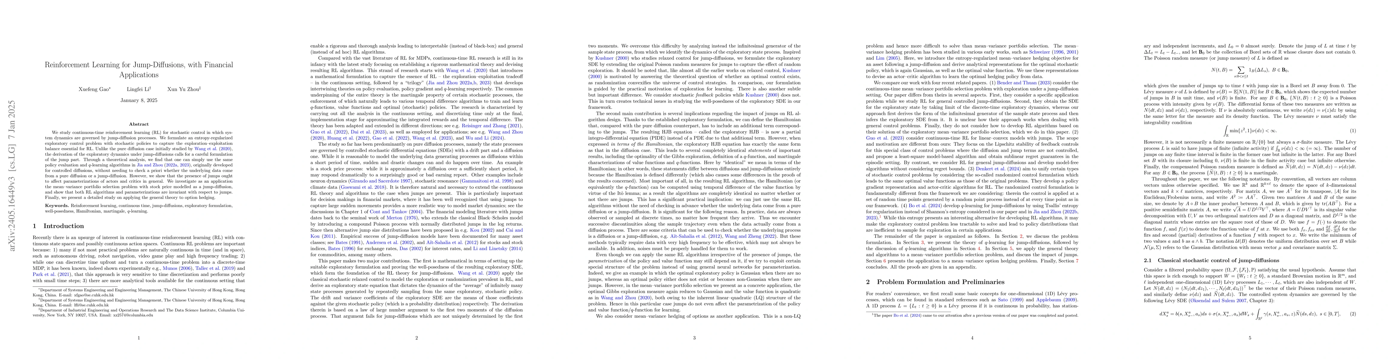 This paper studies continuous-time reinforcement learning for stochastic control governed by jump-diffusion processes, formulating an entropy-regularized exploratory control problem. It finds that existing algorithms for diffusions remain applicable, though jump-diffusions affect actor and critic parameterizations, and applies the approach to mean-variance portfolio selection.
