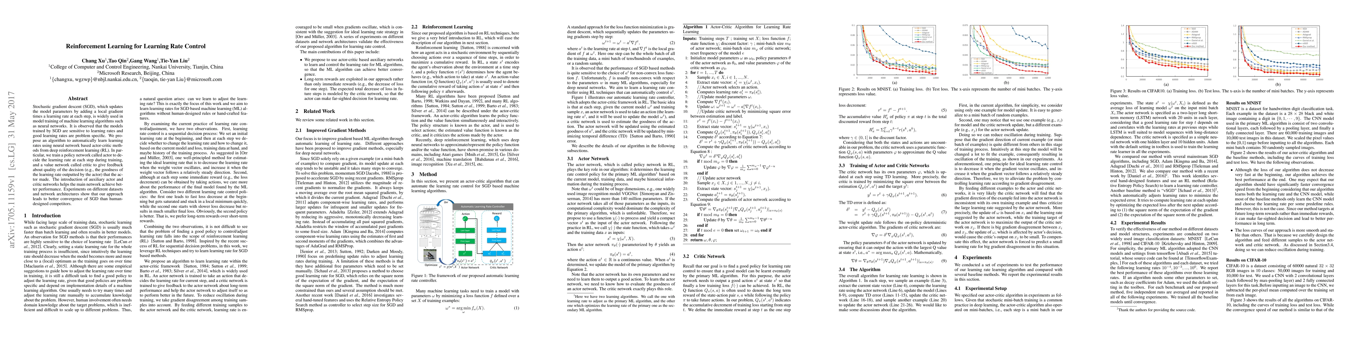 Stochastic gradient descent (SGD), which updates the model parameters by adding a local gradient times a learning rate at each step, is widely used in model training of machine learning algorithms such as neural networks. It is observed that the models trained by SGD are sensitive to learning rates and good learning rates are problem specific. We propose an algorithm to automatically learn learning rates using neural network based actor-critic methods from deep reinforcement learning (RL).In particular, we train a policy network called actor to decide the learning rate at each step during training, and a value network called critic to give feedback about quality of the decision (e.g., the goodness of the learning rate outputted by the actor) that the actor made. The introduction of auxiliary actor and critic networks helps the main network achieve better performance. Experiments on different datasets and network architectures show that our approach leads to better convergence of SGD than human-designed competitors.