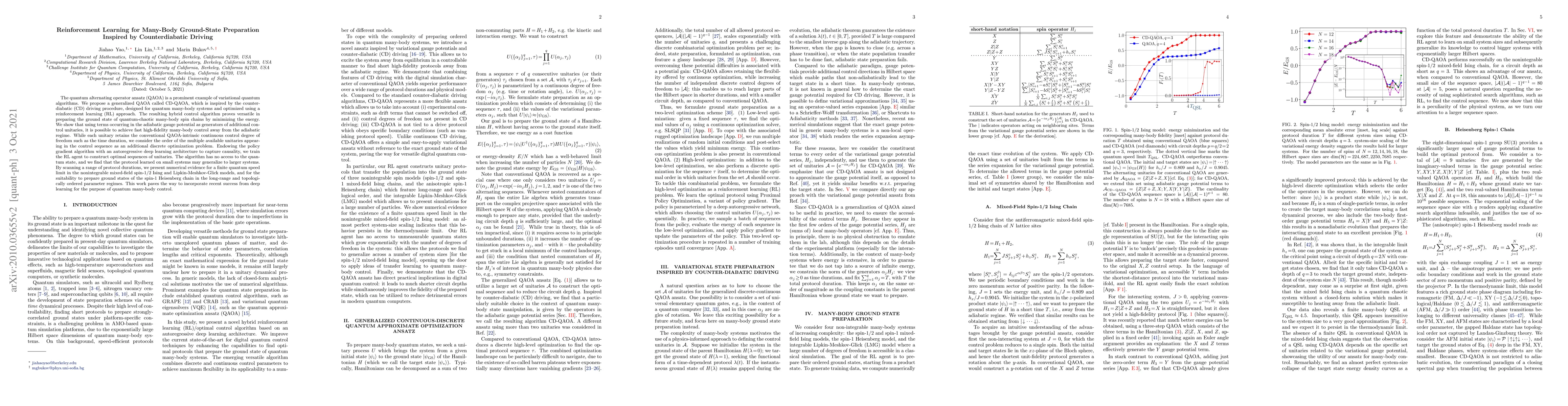 This paper proposes a generalized QAOA called CD-QAOA, utilizing reinforcement learning with an autoregressive deep learning architecture to optimize quantum many-body ground-state preparation via counterdiabatic driving. The hybrid algorithm demonstrates effectiveness in preparing ground states of quantum-chaotic spin chains by minimizing energy and shows potential for generalization across system sizes.