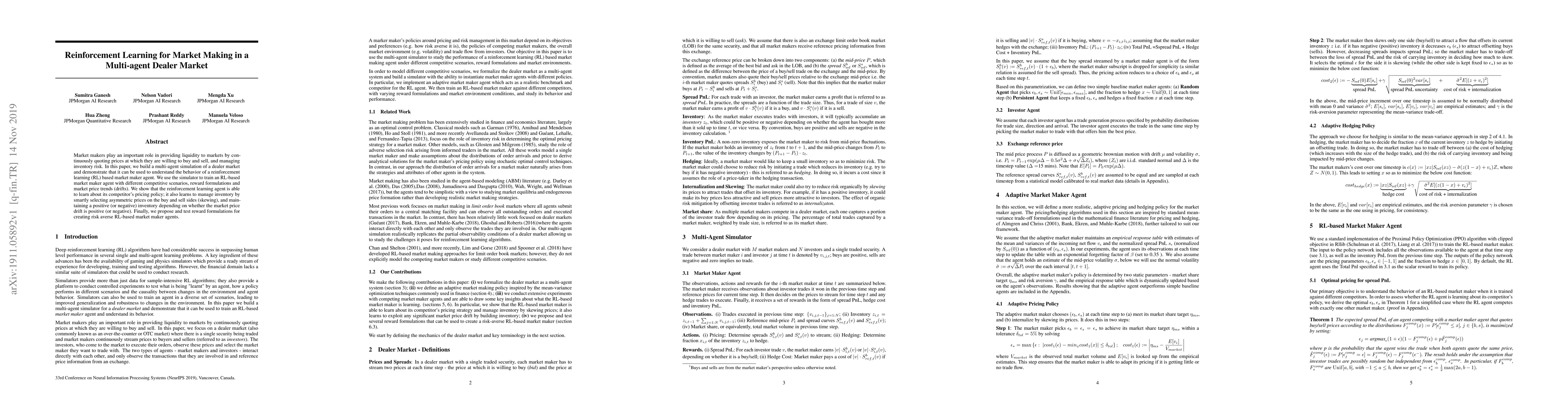 This paper develops a multi-agent simulation to study a reinforcement learning (RL) based market maker in a dealer market, showing that the RL agent can learn competitor pricing, manage inventory through asymmetric pricing, and adapt to market price trends. It also proposes reward formulations for creating risk-averse RL market maker agents.