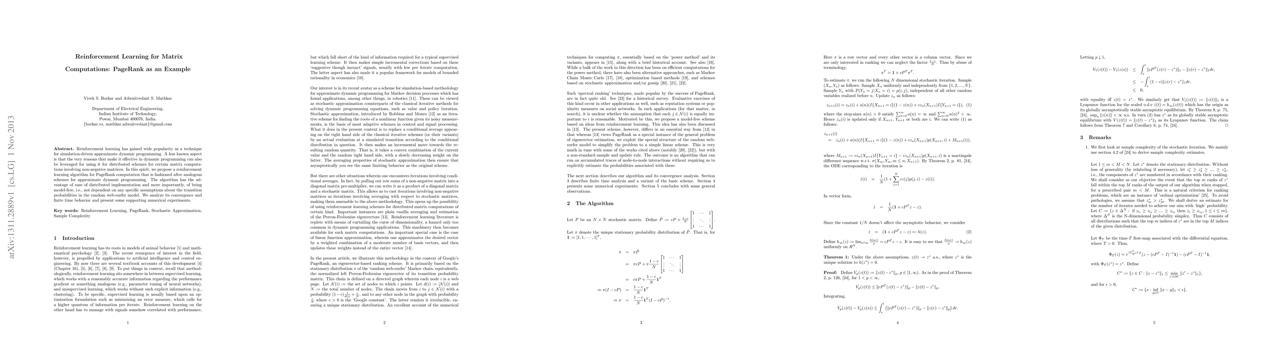 A new reinforcement learning algorithm is proposed for efficient PageRank computation, leveraging its ease of distributed implementation and model-free nature. The algorithm offers a promising approach to accelerate matrix computations involving non-negative matrices in large-scale web networks.