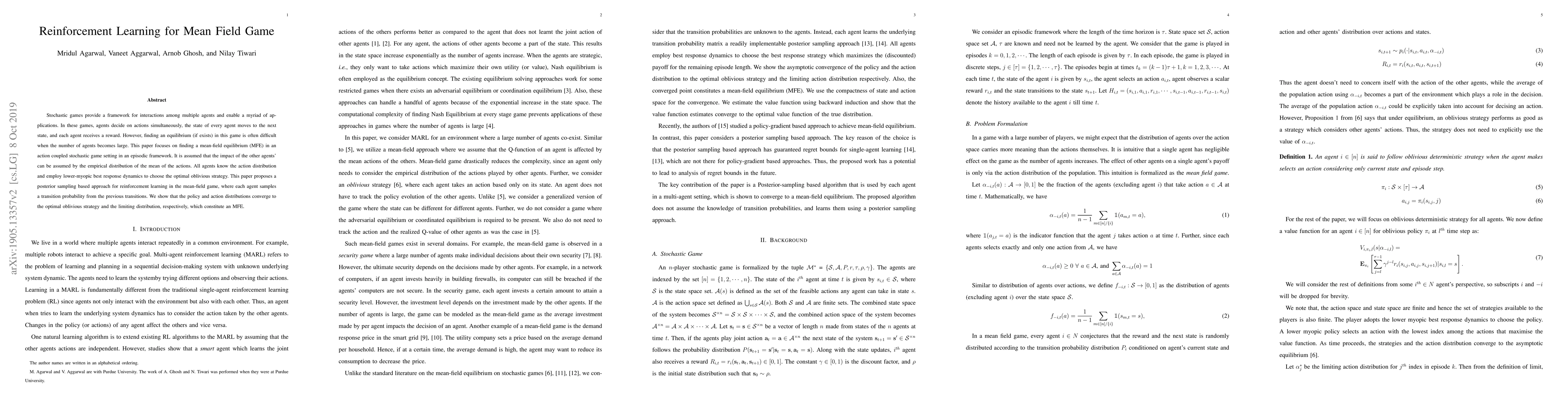 Stochastic games provide a framework for interactions among multiple agents and enable a myriad of applications. In these games, agents decide on actions simultaneously, the state of every agent moves to the next state, and each agent receives a reward. However, finding an equilibrium (if exists) in this game is often difficult when the number of agents becomes large. This paper focuses on finding a mean-field equilibrium (MFE) in an action coupled stochastic game setting in an episodic framework. It is assumed that the impact of the other agents' can be assumed by the empirical distribution of the mean of the actions. All agents know the action distribution and employ lower-myopic best response dynamics to choose the optimal oblivious strategy. This paper proposes a posterior sampling based approach for reinforcement learning in the mean-field game, where each agent samples a transition probability from the previous transitions. We show that the policy and action distributions converge to the optimal oblivious strategy and the limiting distribution, respectively, which constitute an MFE.