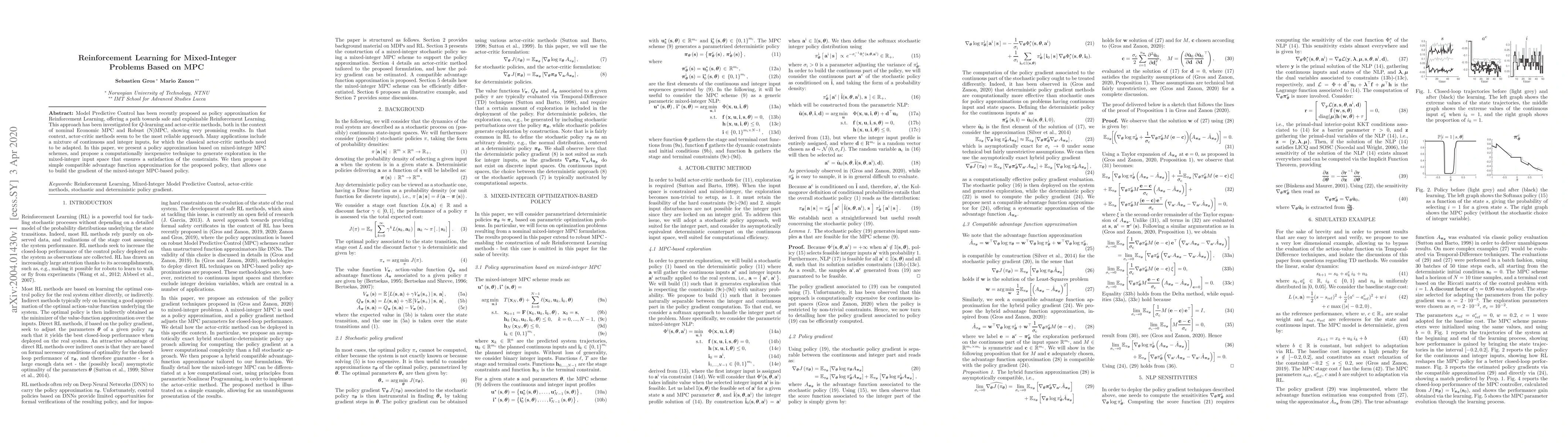 This paper proposes a reinforcement learning approach using mixed-integer Model Predictive Control (MPC) for mixed-integer problems, introducing a cost-effective exploration technique to navigate the mixed-integer input space while satisfying constraints. It also presents an advantage function approximation for the gradient of the mixed-integer MPC-based policy.