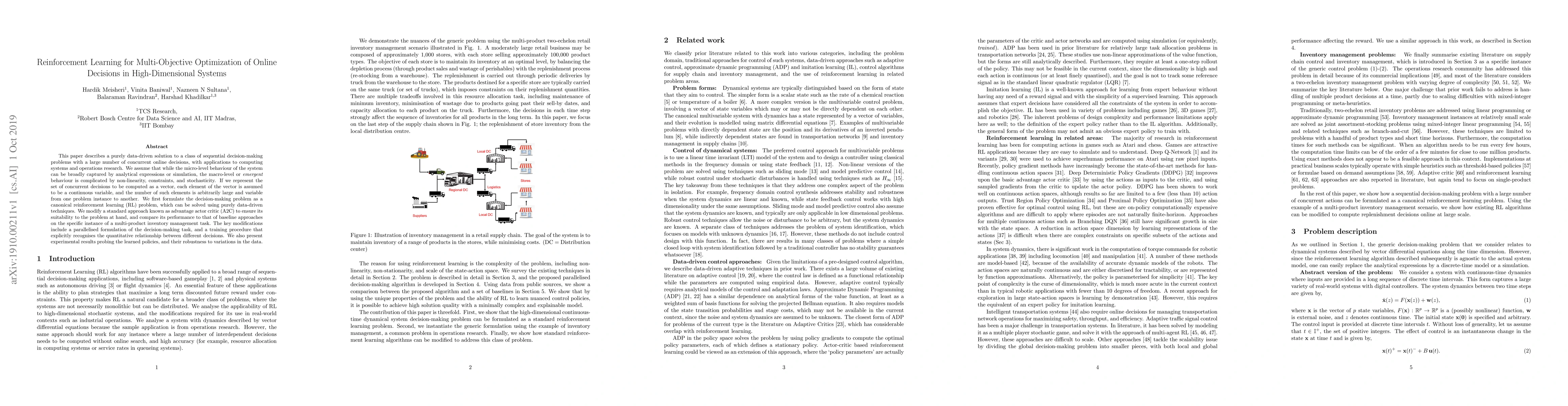 This paper proposes a reinforcement learning approach for optimizing online decisions in high-dimensional systems with multiple objectives, modifying the A2C method for parallelized execution and demonstrating its effectiveness in a multi-product inventory management task. Experimental results show the robustness of the learned policies under data variations.