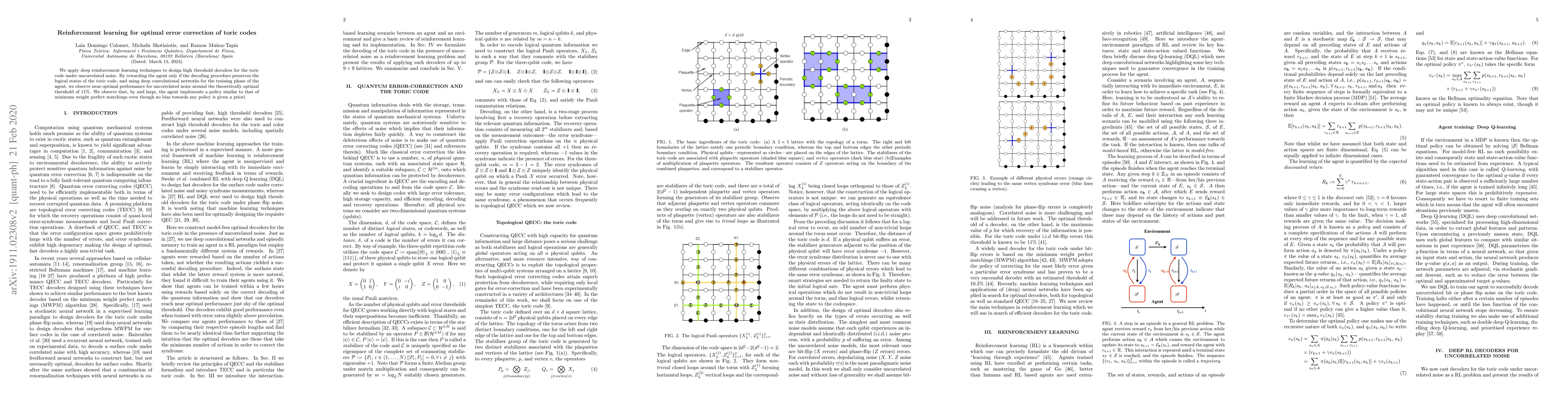 This paper employs deep reinforcement learning to develop optimal decoders for toric codes under uncorrelated noise, achieving near-optimal error correction near the theoretical threshold of 11%. The agent's policy resembles minimum weight perfect matchings, despite no prior bias towards such strategies.