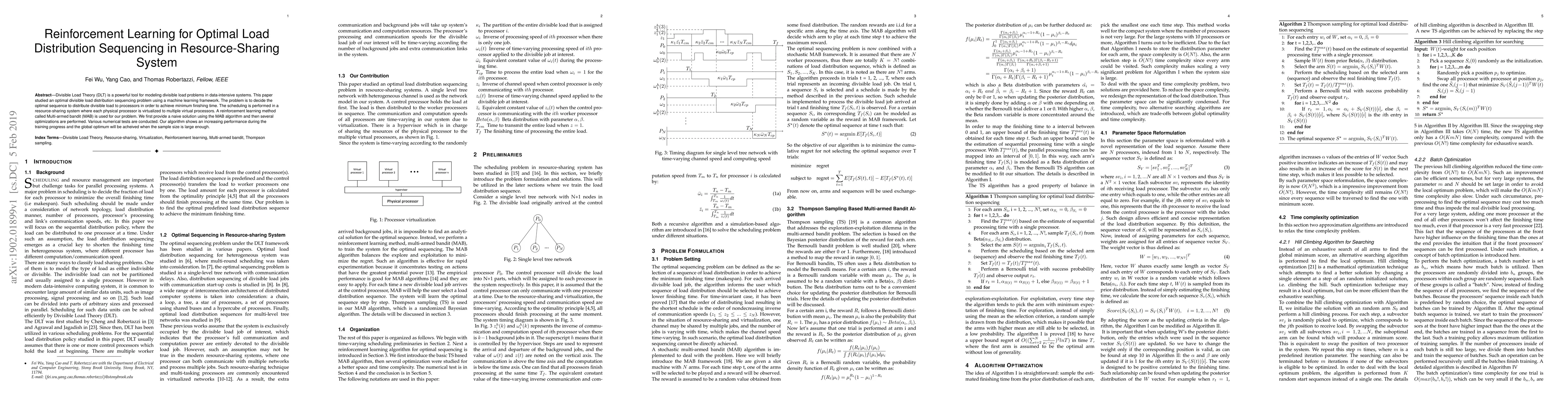 This paper explores optimal load distribution sequencing in resource-sharing systems using Reinforcement Learning, specifically the Multi-armed Bandit algorithm. The study optimizes divisible load distribution to minimize finishing time, demonstrating improved performance and convergence to the global optimum with large sample sizes.