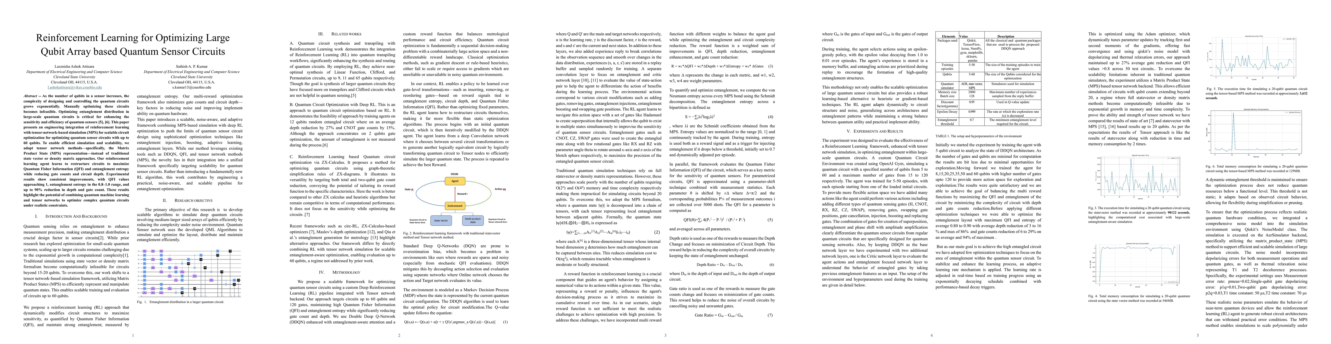 As the number of qubits in a sensor increases, the complexity of designing and controlling the quantum circuits grows exponentially. Manually optimizing these circuits becomes infeasible. Optimizing entanglement distribution in large-scale quantum circuits is critical for enhancing the sensitivity and efficiency of quantum sensors [5], [6]. This paper presents an engineering integration of reinforcement learning with tensor-network-based simulation (MPS) for scalable circuit optimization for optimizing quantum sensor circuits with up to 60 qubits. To enable efficient simulation and scalability, we adopt tensor network methods, specifically the Matrix Product State (MPS) representation, instead of traditional state vector or density matrix approaches. Our reinforcement learning agent learns to restructure circuits to maximize Quantum Fisher Information (QFI) and entanglement entropy while reducing gate counts and circuit depth. Experimental results show consistent improvements, with QFI values approaching 1, entanglement entropy in the 0.8-1.0 range, and up to 90% reduction in depth and gate count. These results highlight the potential of combining quantum machine learning and tensor networks to optimize complex quantum circuits under realistic constraints.