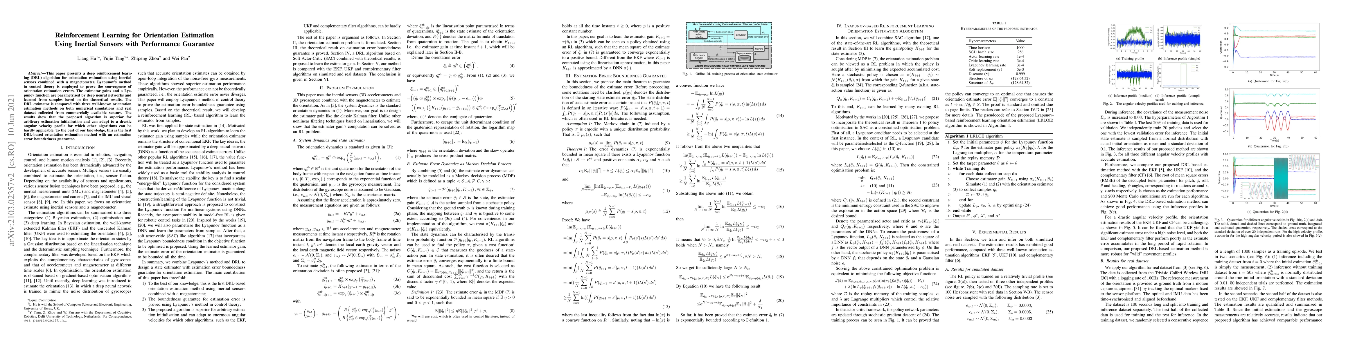 This paper introduces a deep reinforcement learning algorithm for orientation estimation using inertial sensors and a magnetometer, proving its convergence with the Lyapunov method. The DRL estimator outperforms traditional methods in simulations and real-world data, especially under large angular velocities.