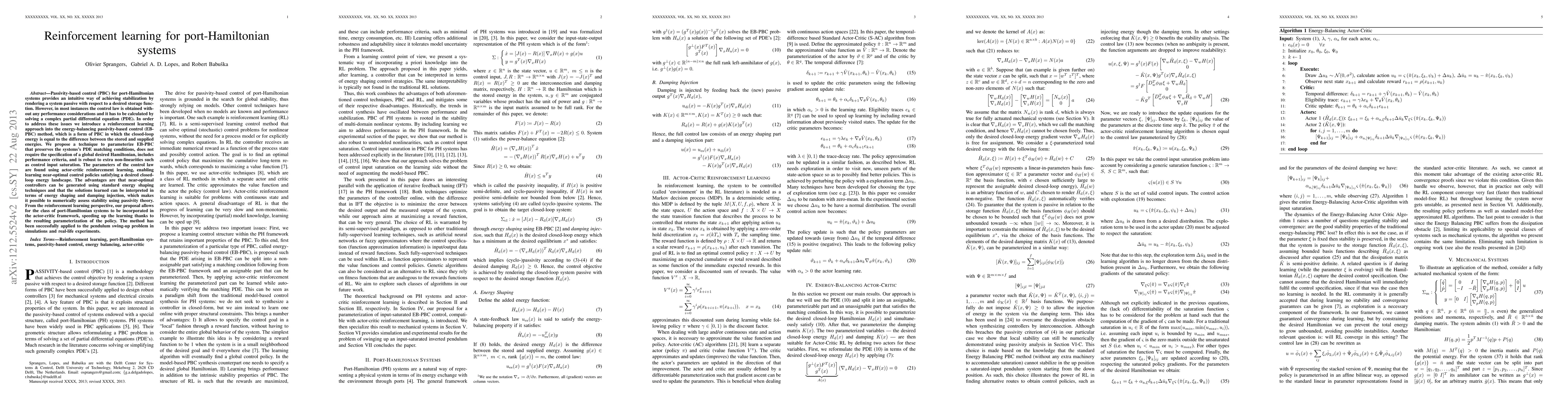 This paper proposes a reinforcement learning approach to enhance energy-balancing passivity-based control (EB-PBC) for port-Hamiltonian systems, enabling near-optimal control without solving complex PDEs. The method incorporates performance criteria and robustness to non-linearities, demonstrating successful application in pendulum swing-up tasks.