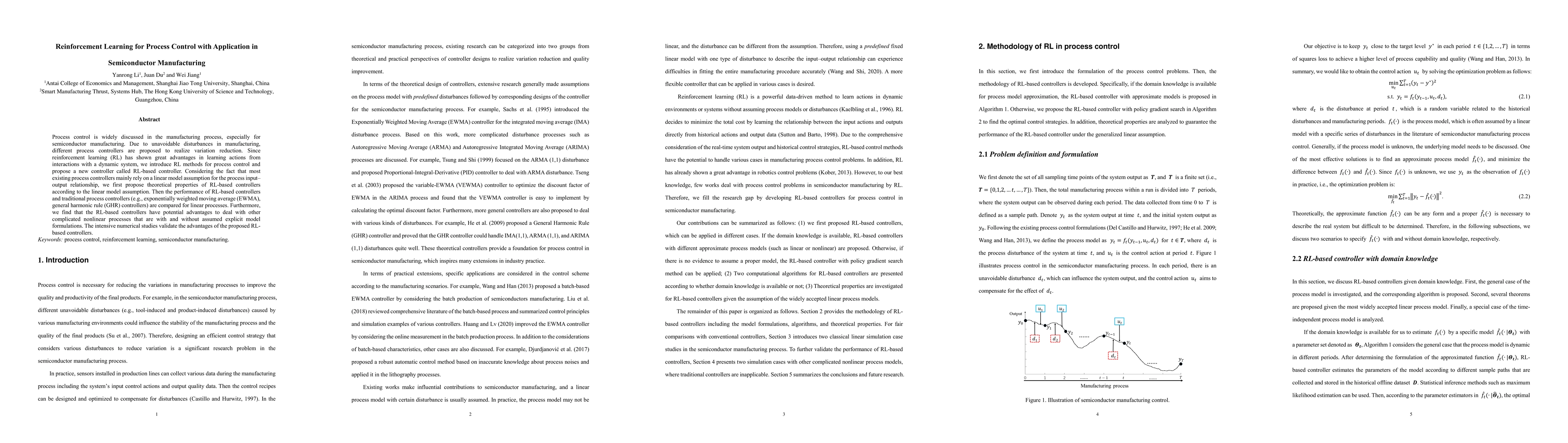 This paper introduces reinforcement learning (RL) methods for process control in semiconductor manufacturing, proposing a new RL-based controller. It compares the performance of RL-based controllers against traditional methods, demonstrating their advantages in handling both linear and nonlinear processes.