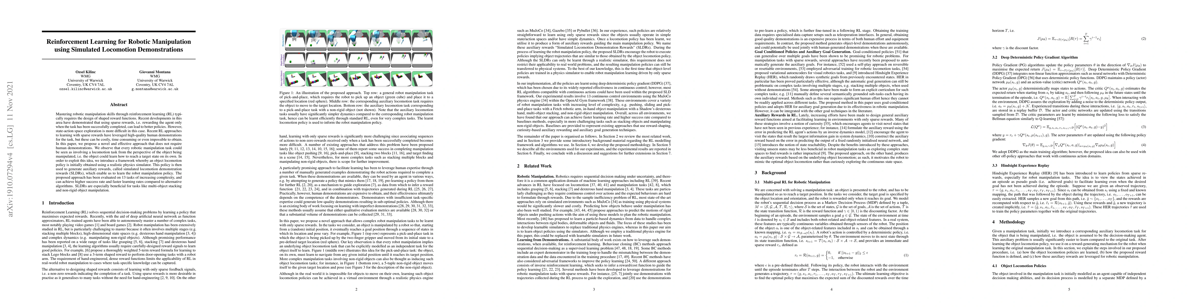 This paper proposes a novel reinforcement learning approach for robotic manipulation that leverages simulated locomotion demonstrations to generate auxiliary rewards without requiring human demonstrations. The method uses a physics simulator to create simulated locomotion demonstration rewards, which facilitate faster learning and higher success rates in manipulation tasks.