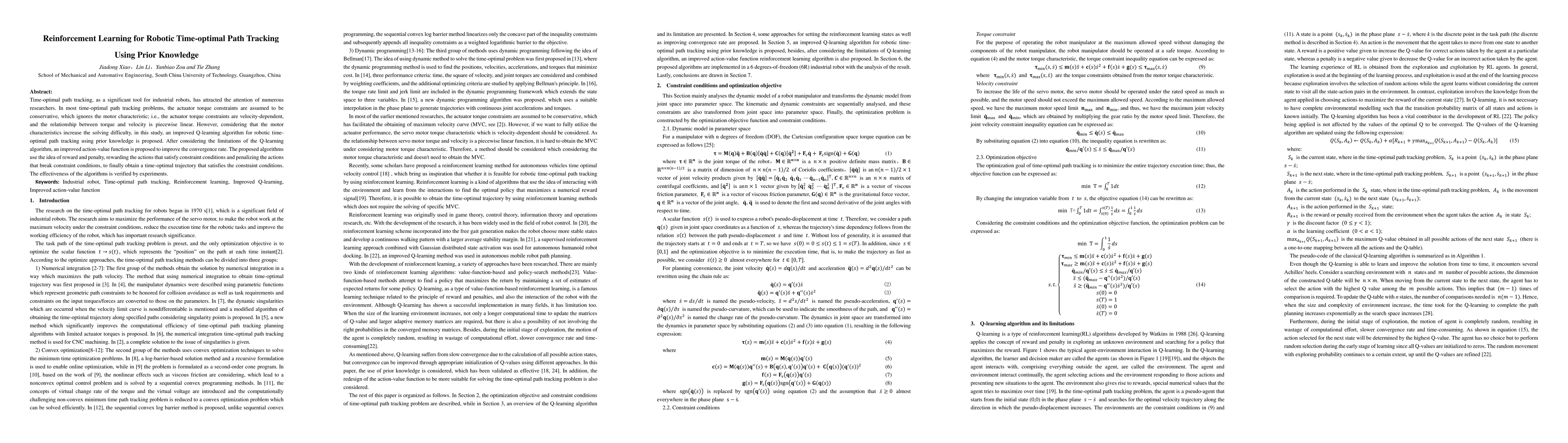Time-optimal path tracking, as a significant tool for industrial robots, has attracted the attention of numerous researchers. In most time-optimal path tracking problems, the actuator torque constraints are assumed to be conservative, which ignores the motor characteristic; i.e., the actuator torque constraints are velocity-dependent, and the relationship between torque and velocity is piecewise linear. However, considering that the motor characteristics increase the solving difficulty, in this study, an improved Q-learning algorithm for robotic time-optimal path tracking using prior knowledge is proposed. After considering the limitations of the Q-learning algorithm, an improved action-value function is proposed to improve the convergence rate. The proposed algorithms use the idea of reward and penalty, rewarding the actions that satisfy constraint conditions and penalizing the actions that break constraint conditions, to finally obtain a time-optimal trajectory that satisfies the constraint conditions. The effectiveness of the algorithms is verified by experiments.