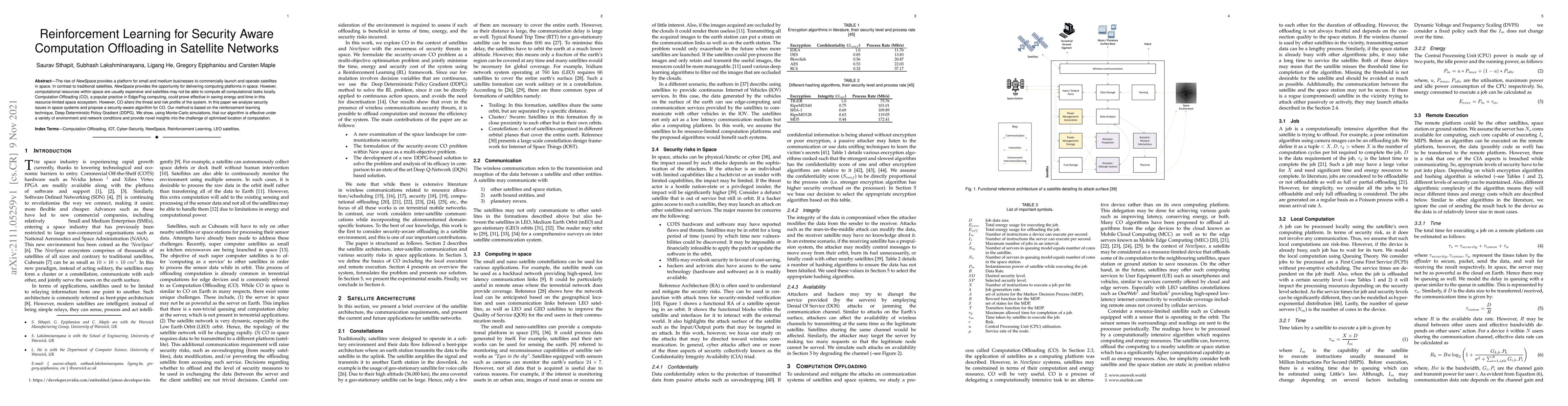 This paper proposes a security-aware computation offloading algorithm for satellite networks using reinforcement learning, specifically Deep Deterministic Policy Gradient (DDPG). The method aims to optimize computation placement while addressing security challenges, demonstrating effectiveness through Monte-Carlo simulations.