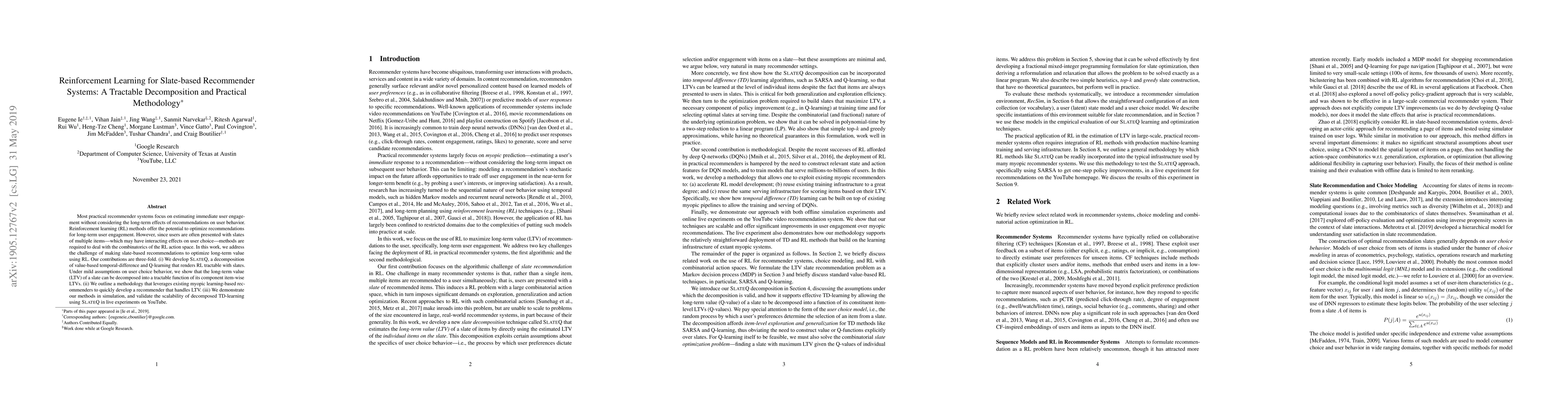 This paper proposes SLATEQ, a reinforcement learning method to optimize slate-based recommendations for long-term user engagement, decomposing the long-term value of a slate into manageable components. It also presents a practical methodology integrating existing recommenders and validates its effectiveness through simulations and live experiments on YouTube.