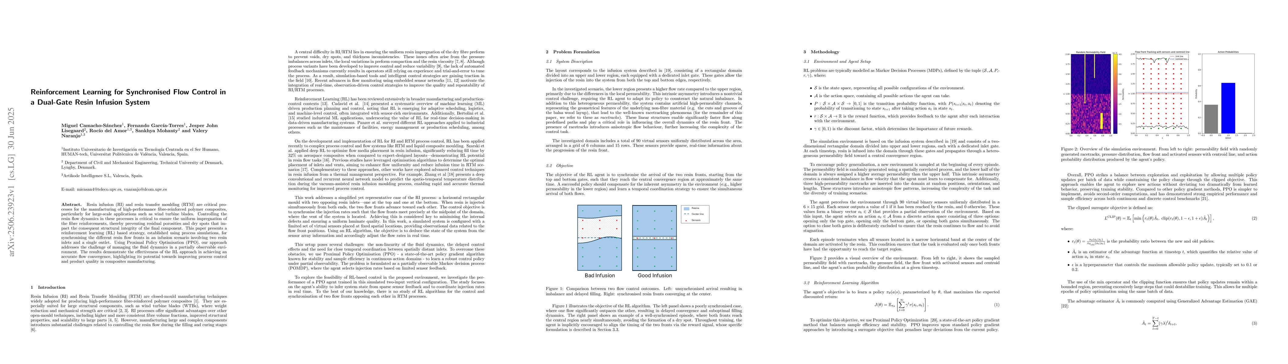 Resin infusion (RI) and resin transfer moulding (RTM) are critical processes for the manufacturing of high-performance fibre-reinforced polymer composites, particularly for large-scale applications such as wind turbine blades. Controlling the resin flow dynamics in these processes is critical to ensure the uniform impregnation of the fibre reinforcements, thereby preventing residual porosities and dry spots that impact the consequent structural integrity of the final component. This paper presents a reinforcement learning (RL) based strategy, established using process simulations, for synchronising the different resin flow fronts in an infusion scenario involving two resin inlets and a single outlet. Using Proximal Policy Optimisation (PPO), our approach addresses the challenge of managing the fluid dynamics in a partially observable environment. The results demonstrate the effectiveness of the RL approach in achieving an accurate flow convergence, highlighting its potential towards improving process control and product quality in composites manufacturing.