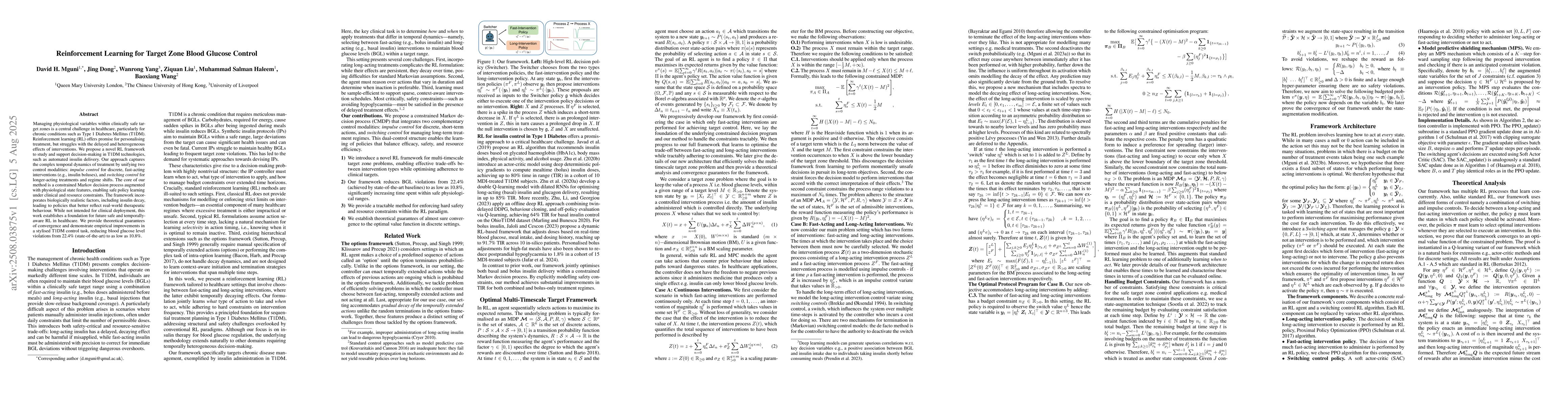Managing physiological variables within clinically safe target zones is a central challenge in healthcare, particularly for chronic conditions such as Type 1 Diabetes Mellitus (T1DM). Reinforcement learning (RL) offers promise for personalising treatment, but struggles with the delayed and heterogeneous effects of interventions. We propose a novel RL framework to study and support decision-making in T1DM technologies, such as automated insulin delivery. Our approach captures the complex temporal dynamics of treatment by unifying two control modalities: \textit{impulse control} for discrete, fast-acting interventions (e.g., insulin boluses), and \textit{switching control} for longer-acting treatments and regime shifts. The core of our method is a constrained Markov decision process augmented with physiological state features, enabling safe policy learning under clinical and resource constraints. The framework incorporates biologically realistic factors, including insulin decay, leading to policies that better reflect real-world therapeutic behaviour. While not intended for clinical deployment, this work establishes a foundation for future safe and temporally-aware RL in healthcare. We provide theoretical guarantees of convergence and demonstrate empirical improvements in a stylised T1DM control task, reducing blood glucose level violations from 22.4\% (state-of-the-art) to as low as 10.8\%.