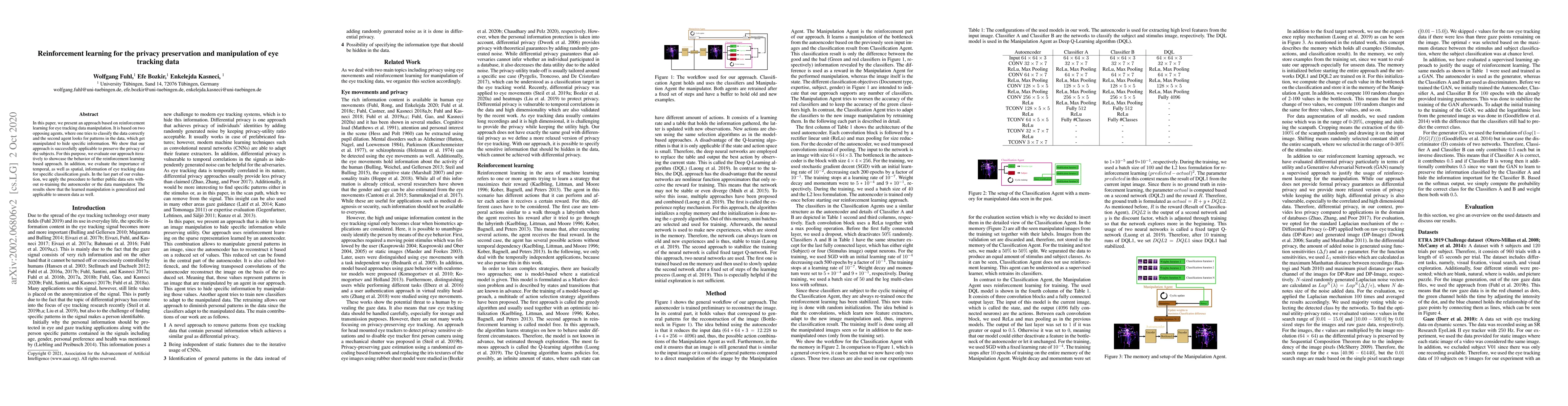 In this paper, we present an approach based on reinforcement learning for eye tracking data manipulation. It is based on two opposing agents, where one tries to classify the data correctly and the second agent looks for patterns in the data, which get manipulated to hide specific information. We show that our approach is successfully applicable to preserve the privacy of the subjects. For this purpose, we evaluate our approach iteratively to showcase the behavior of the reinforcement learning based approach. In addition, we evaluate the importance of temporal, as well as spatial, information of eye tracking data for specific classification goals. In the last part of our evaluation, we apply the procedure to further public data sets without re-training the autoencoder or the data manipulator. The results show that the learned manipulation is generalized and applicable to unseen data as well.