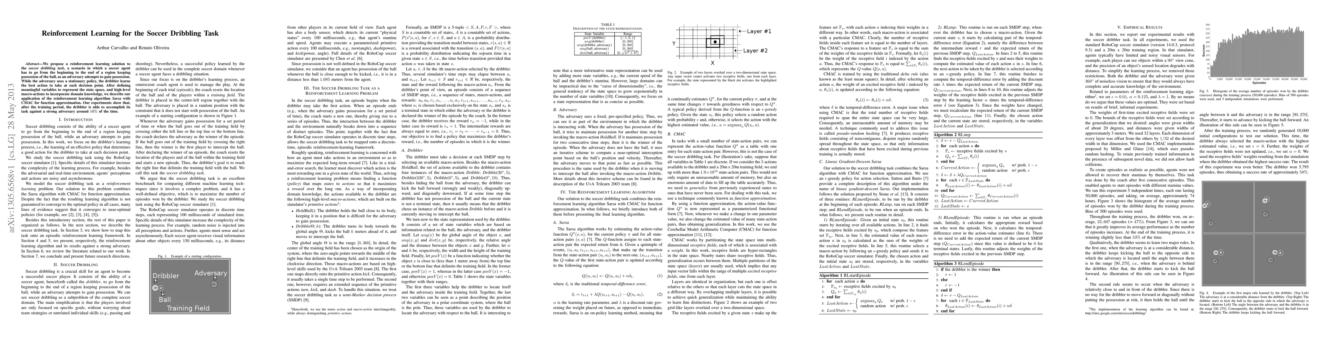 This paper proposes a reinforcement learning approach using Sarsa with CMAC for a soccer dribbling task, where an agent must navigate from start to finish while maintaining possession against a stationary adversary. The method successfully trains the agent to accomplish the task around 58% of the time post-training.