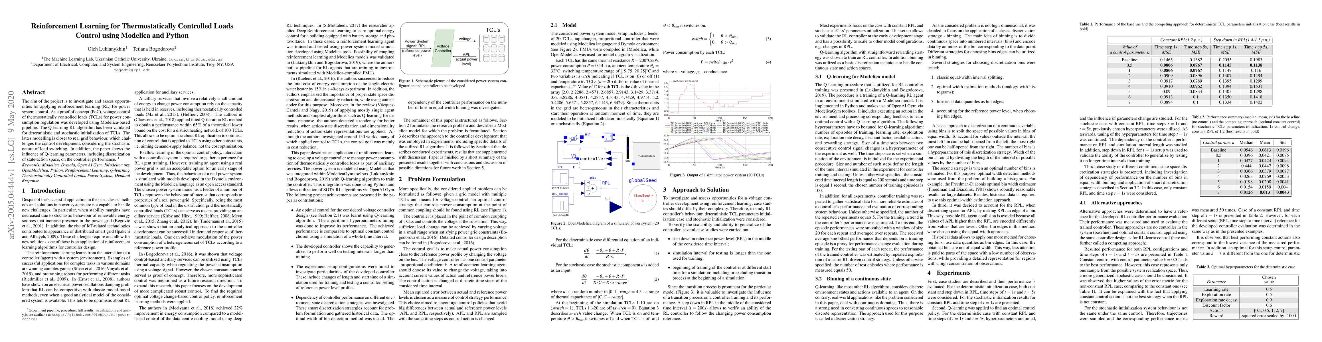 The aim of the project is to investigate and assess opportunities for applying reinforcement learning (RL) for power system control. As a proof of concept (PoC), voltage control of thermostatically controlled loads (TCLs) for power consumption regulation was developed using Modelica-based pipeline. The Q-learning RL algorithm has been validated for deterministic and stochastic initialization of TCLs. The latter modelling is closer to real grid behaviour, which challenges the control development, considering the stochastic nature of load switching. In addition, the paper shows the influence of Q-learning parameters, including discretization of state-action space, on the controller performance.